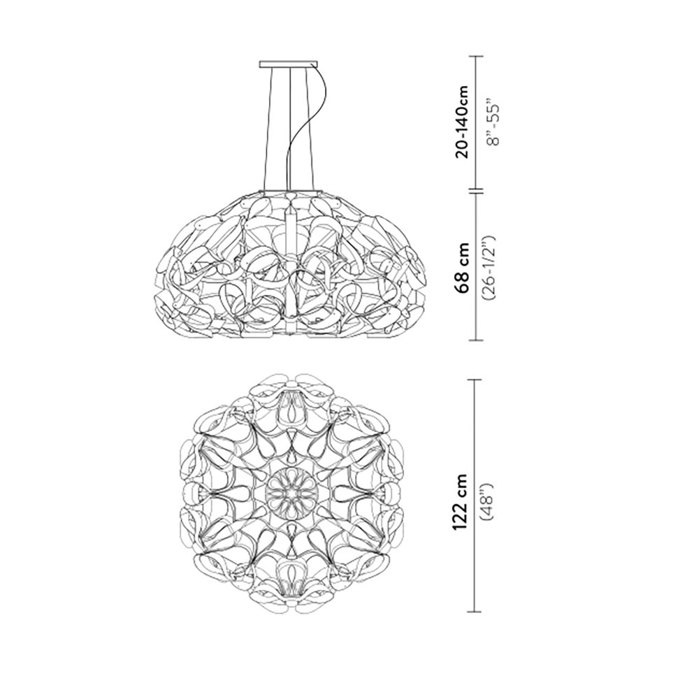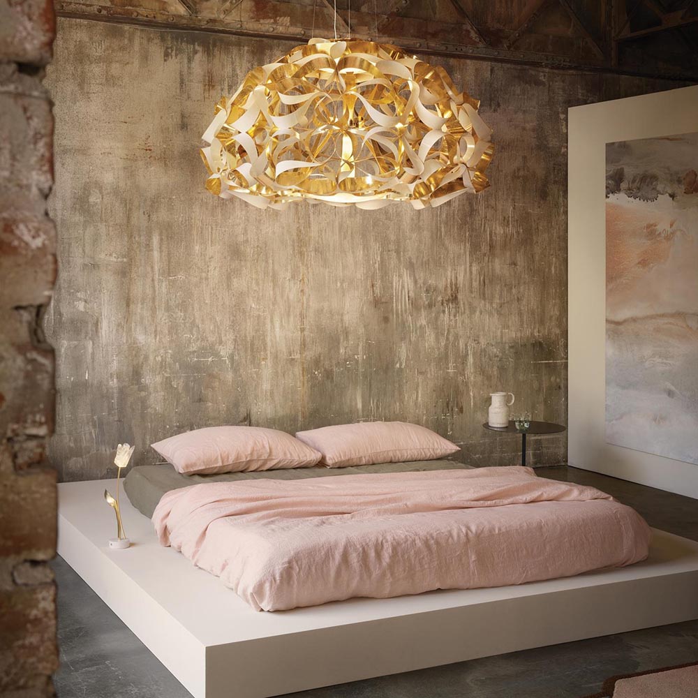 Dit prachtige design is een ware eyecatcher in uw woning. Gemaakt van de meest ingenieuze materialen wat de prachtige vorm van de lamp mogelijk maakt. De Quantica van het Italiaanse merk Slamp heeft een kap met een doorsnede van maar liefst 122 cm. Prachtig voor boven een grote eettafel, in de hal of in de slaapkamer. Met zijn elegante design steelt deze lamp de show. De kap is aan de boven en onderzijde voorzien van lichtpunten met een diffuser zodat er sfeervol licht kan worden verspreid. Dit wordt ook in de lamp verspreid waardoor de gouden kap een waar spektakel wordt om te zien. De grote hanglamp hangt aan 3 smalle draden en een snoer en wordt met een ronde witte bevestiging aan het plafond opgehangen. De Italiaanse design hanglamp wordt geleverd zonder lichtbronnen.