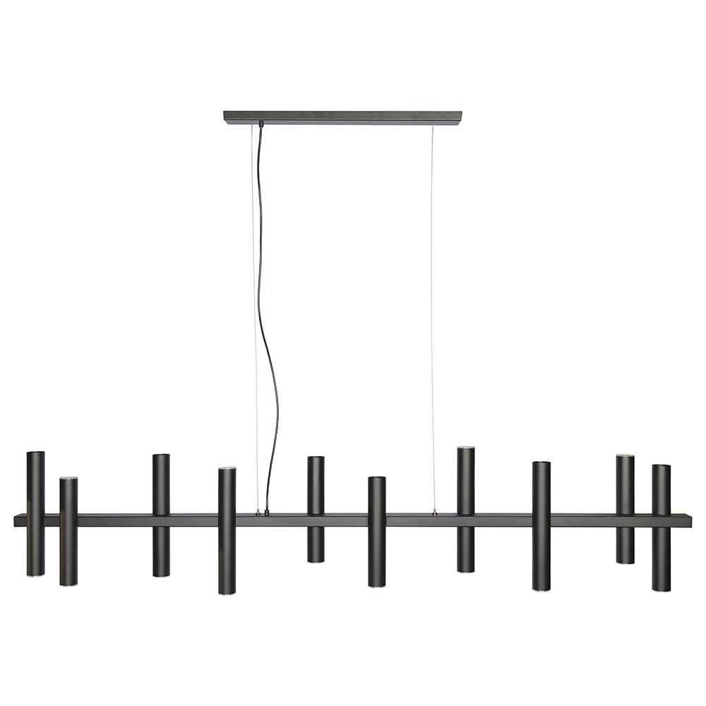 Een uniek design met een elegante, luxe uitstraling. Deze hanglamp is vervaardigd uit metaal en afgewerkt met een mat zwarte finish. De matte afwerking geeft deze hanglamp een stoere en stijlvolle look die mooi is te combineren in diverse woonstijlen. De hanglamp lijkt een 10-lichts te zijn, maar is voorzien van 14 lichtpunten. De 10 cilinders schijnen naar beneden, maar 4 stuks hebben ook een lichtpunt aan de bovenzijde. Zo zorgt de grote hanglamp dus ook voor indirecte lichtverspreiding in de ruimte. Ideaal voor boven een grote eettafel of een vergadertafel in een kantoor. Waar de lamp ook hangt, met zijn unieke design is het ongetwijfeld de eyecatcher in de ruimte.
