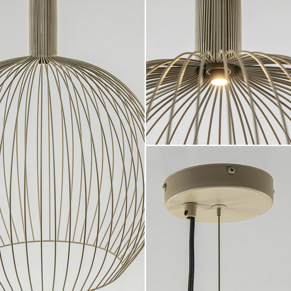 Deze trendy draad hanglamp is een mooie toevoeging aan het interieur. De ronde hanglamp is gemaakt van metaal en voorzien van een finish in de kleur mat zand. Dit geeft de lamp een trendy en Scandinavische look en feel die mooi matcht in diverse woonstijlen. De ronde draadkap hangt aan een dun staaldraad en een zwart stof omwonden snoer die beide naar wens zijn in te korten. De maximale hoogte van de lamp is 190 cm. Door de open constructie van de hanglamp bepaald de lichtbron veelal de sfeer. Kies voor de kleine spot Pucc (art: 05320014) waardoor de aandacht volledig naar de lamp gaat of een grote decoratieve lichtbron die de lamp complementeert. De draad hanglamp is dimbaar middels een externe dimmer (exclusief).