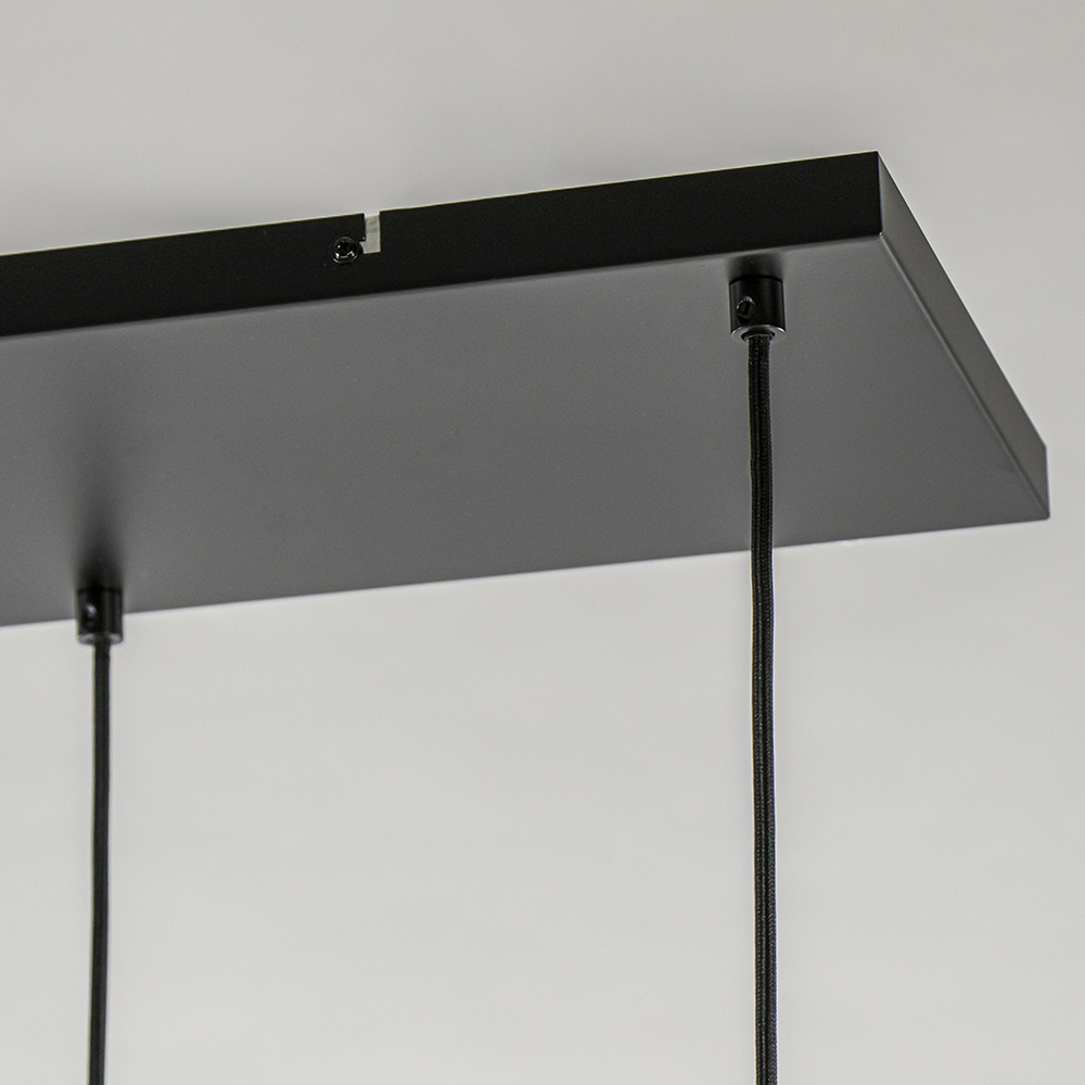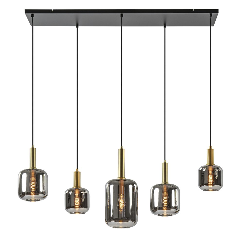 – afm: 115x32x150 cm – kap 1: Ø22×52 cm – kap 2: Ø22×36 cm – kap 3: Ø15×26 cm – bevestiging: 110x25x2,5 cm – metaal – mat zwart/antiek brons – smoke glas – in hoogte verstelbaar – exclusief lichtbron (5x E27) – dimbaar (exclusief)