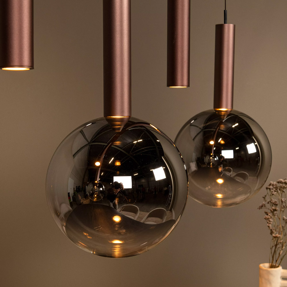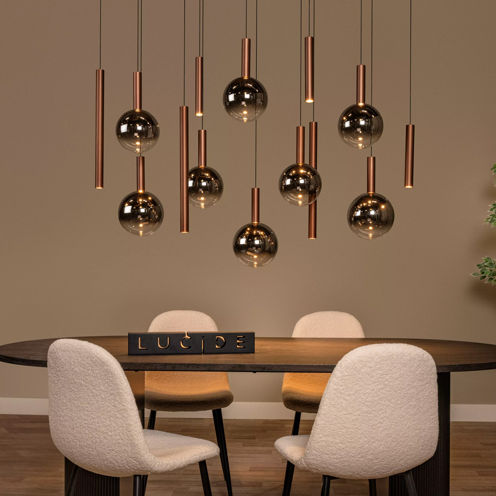 Specificaties: • Kleur: Koper met fumé accenten • Vorm: Ovaal • Totale lamp: H 100–210 cm × L 140 cm × B 54 cm • Bevestigingsplaat: H 4 cm × L 140 cm × B 54 cm • Kap per stuk: H 25 cm × Ø3,5 cm • Materiaal: Aluminium • Kabelkleur: Zwart • Lichtbron: 14 x geïntegreerde LED • Wattage: 14 x 4,4W • Lumen: 14 x 360 lm • Lichtkleur: Instelbaar 2200K – 3300K • Dimbaar: Ja, via externe wandschakelaar