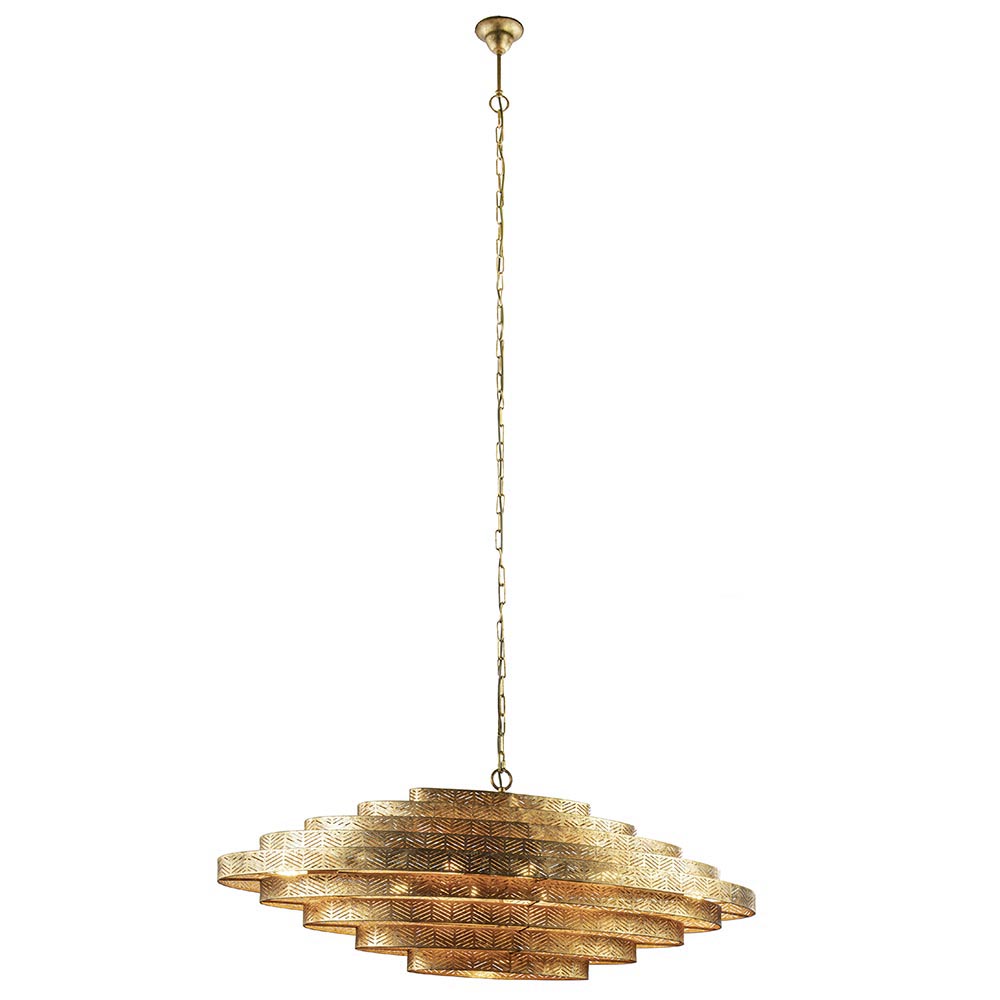 Deze grote metalen hanglamp maakt een statement boven de eetkamertafel. De metalen kap heeft een ovale vorm en bestaat uit verschillende ringen die aan elkaar vast zitten. Iedere ring heeft een patroon verwerkt in het metaal. Dit zorgt ervoor dat de kap genoeg licht doorlaat maar dat u niet rechtstreeks in een lichtbron kijkt. De kap is voorzien van 8 lichtpunten met een E14 fitting en nog één extra lichtpunt aan de onderkant met een GU10 fitting. Deze laatste schijnt recht op het oppervlakte waar de lamp boven hangt. Op het armatuur zelf zit een schakelaar om deze spot apart te bedienen. De lamp is uitgevoerd in een bronzen kleur met een zelfde kleurige grove ketting. Deze ketting is in te nemen tot de gewenste hoogte. Deze hanglamp is echt een eyecatcher.