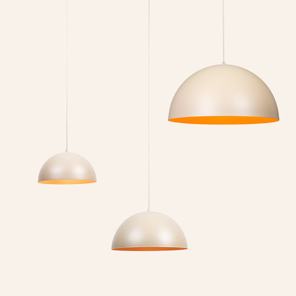 Deze serie is verkrijgbaar in zes uitvoeringen: twee kleuren (beige/zand en brons) en drie formaten (S, M en L). Hierdoor kun je de lamp exact afstemmen op de ruimte. Kies één statementlamp of combineer meerdere maten en kleuren voor een speels maar rustig geheel — bijvoorbeeld boven een lange eettafel of kookeiland.