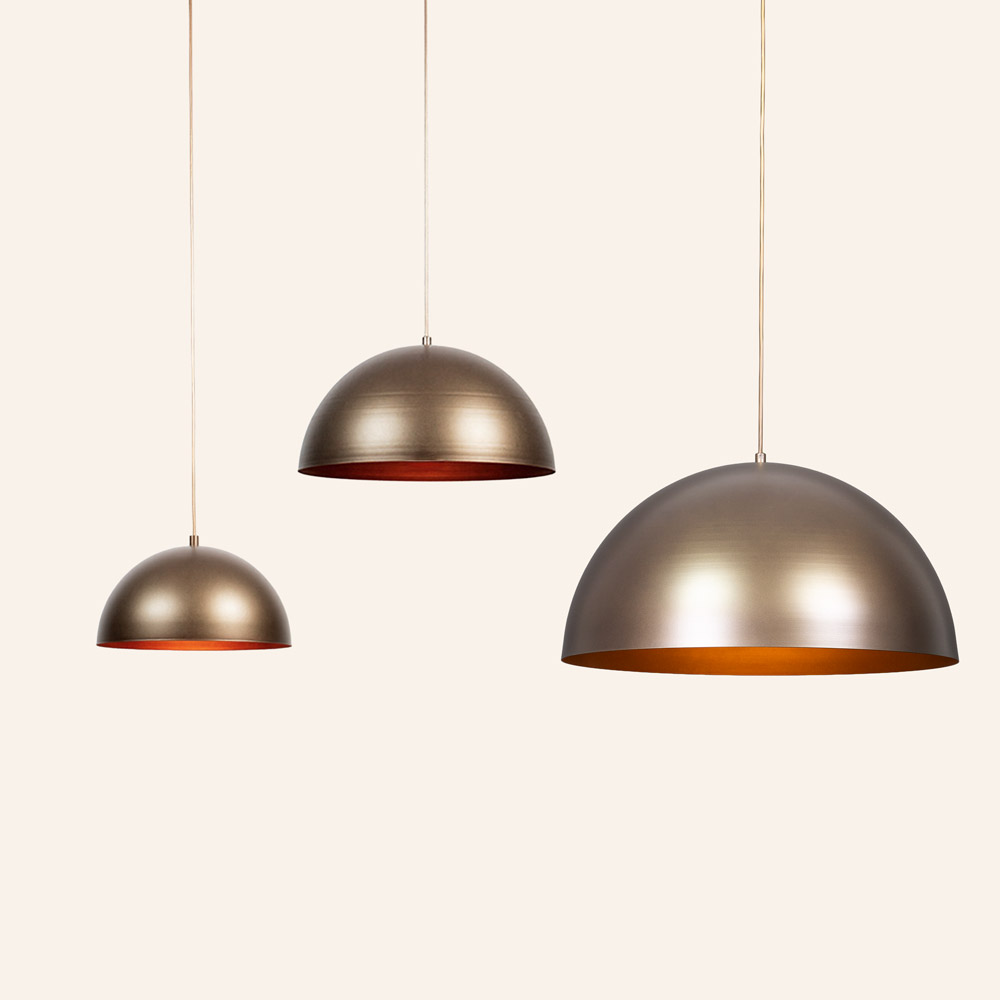 Deze serie is verkrijgbaar in zes uitvoeringen: twee kleuren (beige/zand en brons) en drie formaten (S, M en L). Hierdoor kun je de lamp exact afstemmen op de ruimte. Kies één statementlamp of combineer meerdere maten en kleuren voor een speels maar rustig geheel — bijvoorbeeld boven een lange eettafel of kookeiland.