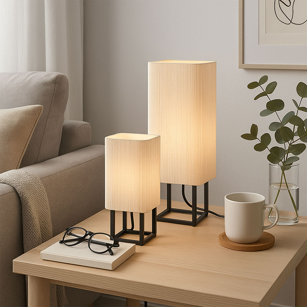 Specificaties: • Serie: Wyn • Kleur: Mat zwart & crème • Materiaal: Metaal & touw • Lichtbron: 1 × E27 (niet meegeleverd) • Snoer: Inclusief met schakelaar • Afmetingen: – Klein: H 39 × 16,5 × 16,5 cm – Groot: H 50,5 × 21,5 × 21,5 cm