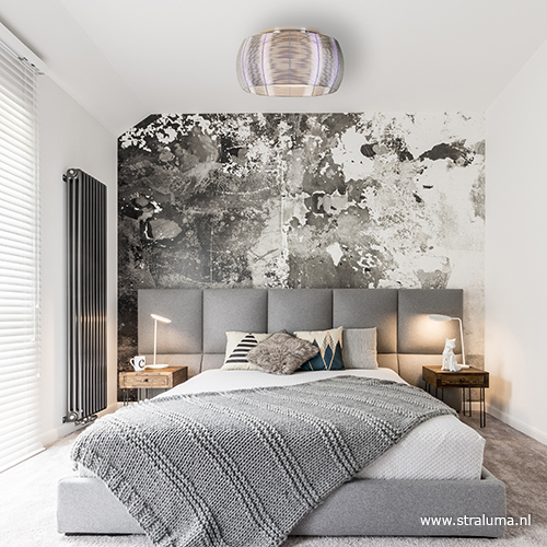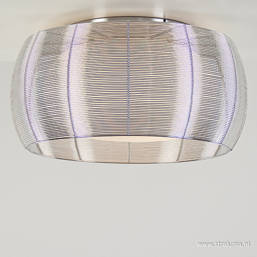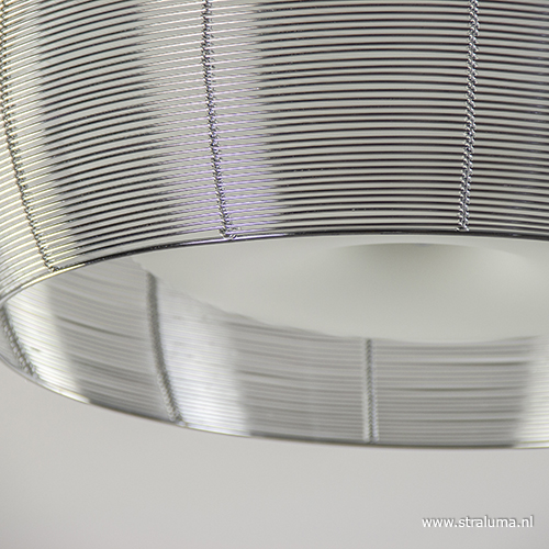 Op zoek naar een plafondlamp-plafonnière die mag opvallen? Dan is dit wat u zoekt. De grote ronde kap van 50 cm is gemaakt van een zilveren frame waartussen zilveren ijzerdraden zijn gevlochten. Dit geeft de kap een draadlamp effect. Voordeel van deze lamp is dat deze van binnen is afgewerkt met een mat glazen kap, dit zorgt ervoor dat u niet direct in de lichtbron kijkt en het matte glas zorgt voor een warme en sfeervolle verlichting. De grote plafondlamp wordt met een chromen plafondplaat opgehangen. Door z’n grootte past de lamp mooi in een slaap- of woonkamer.