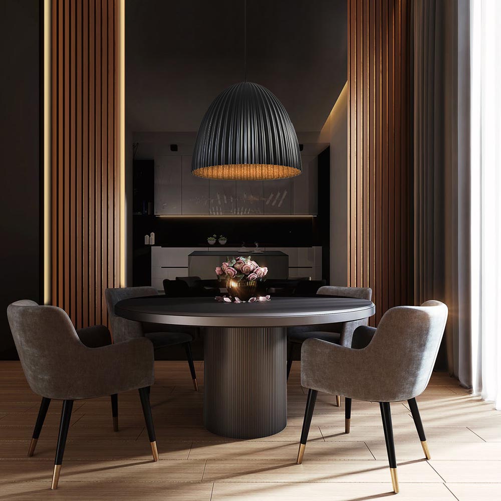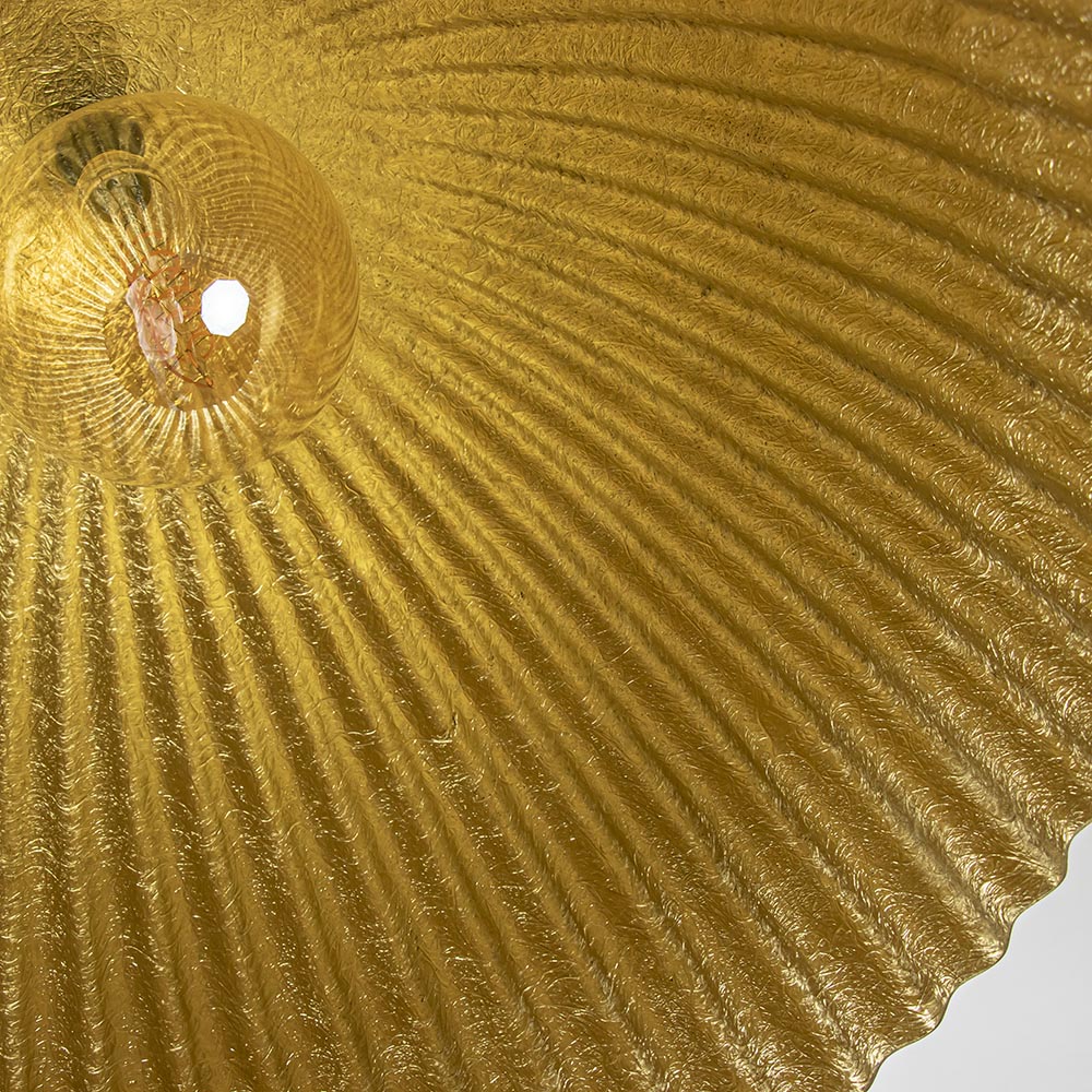 Deze grote hanglamp is gemaakt van een glasvezel-composiet. Hierdoor is de lamp, ondanks het formaat toch licht van gewicht. De buitenzijde van de lamp, uitgevoerd in mat zwart, is glad afgewerkt. Aan de binnenzijde is de vezelstructuur zichtbaar. Deze is afgewerkt in glanzend goud, dit zorgt voor mooi warm licht. De hoge koepelvorm is voorzien van golven. Een prachtige lamp in een ruimte met hogere plafonds.