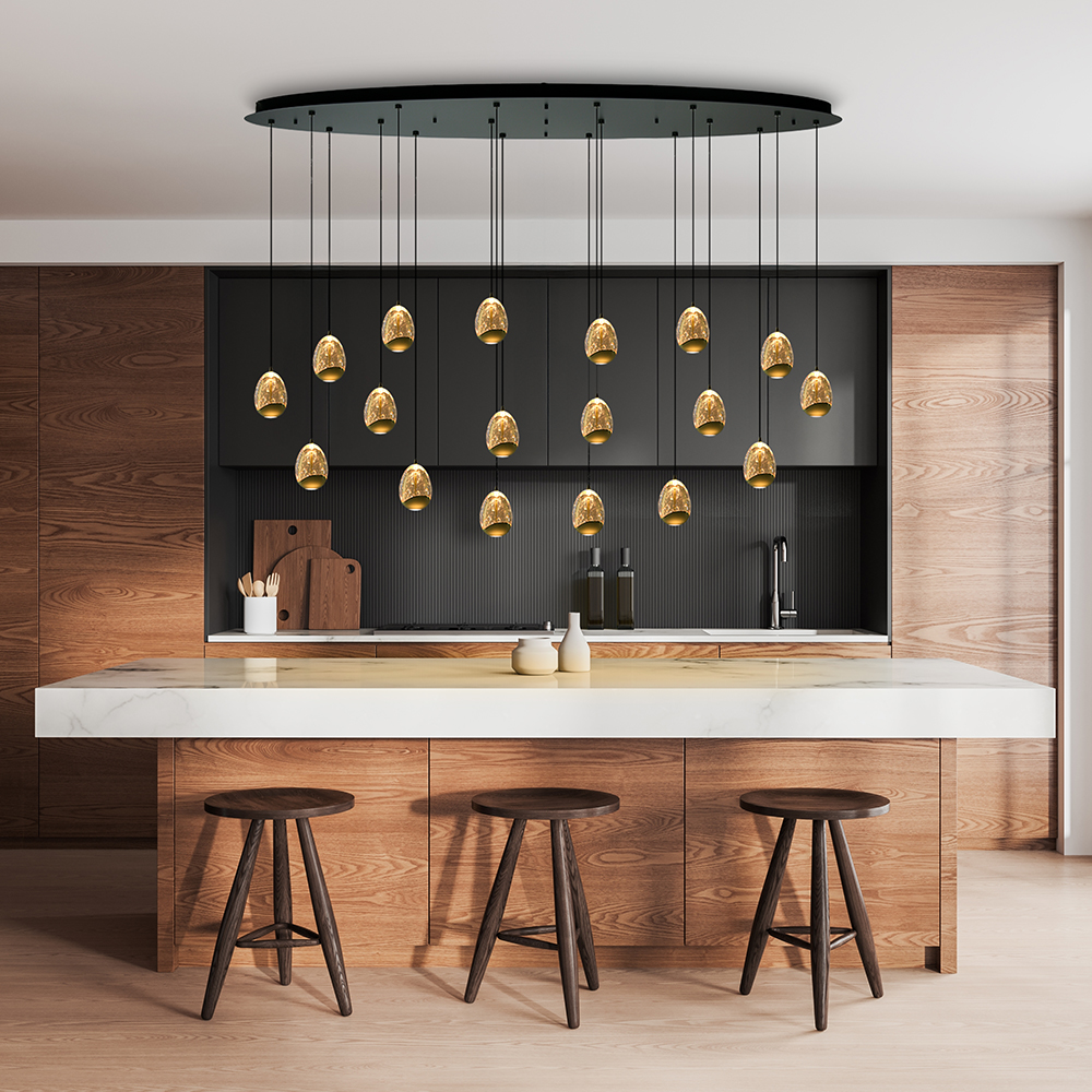 Maak een statement in je interieur met de spectaculaire Golden Egg 18-lichts hanglamp. Deze indrukwekkende lamp is een waar kunstwerk aan het plafond en tilt elke ruimte naar een hoger niveau. De 18 hangende lichtpunten, elk in de vorm van een elegant goud ei, zijn vervaardigd uit mondgeblazen glas met een subtiele bubbelstructuur, wat zorgt voor een prachtig sprankelend lichteffect. De glazen bollen zijn in hoogte te verstellen tot max 160 cm en hangen aan een grote, ovale plafondplaat in zwart metaal, wat een stijlvol contrast vormt met het warme gouden glas. Ideaal boven een kookeiland, eettafel of in een vide waar ruimte is voor een echte blikvanger.