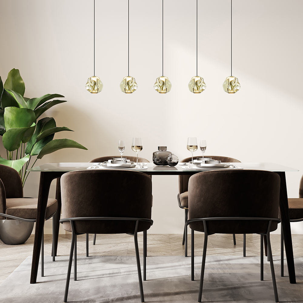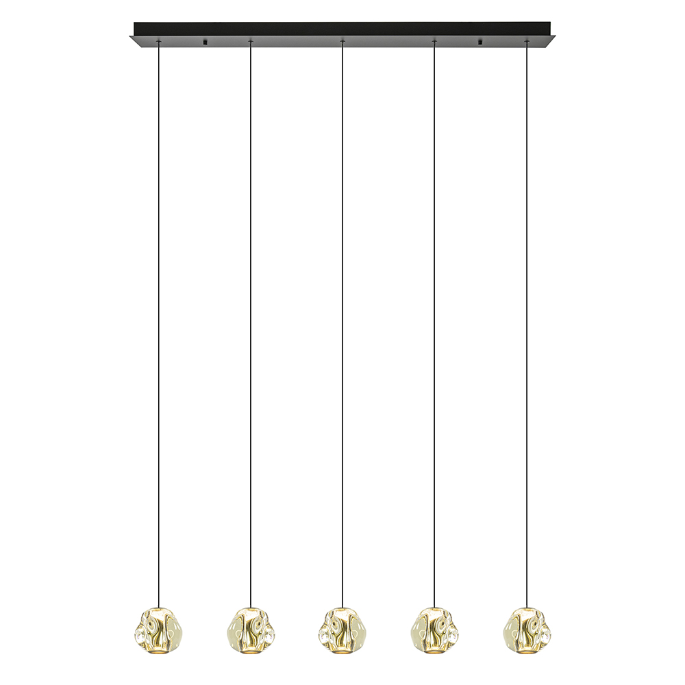Een prachtige stijlvolle 5-lichts hanglamp die de eetkamer elegant verrijkt. De LED hanglamp heeft organische kappen van glas in de kleur amber. Dit is gecombineerd met metalen details in het mat zwart en brushed gold. De samenstelling geeft een glamoureuze uitstraling aan de lamp. De kappen zijn van binnen voorzien van geïntegreerd LED en verspreiden mooi en sfeervol warm wit licht naar beneden. Zo wordt de tafel onder de lamp goed uitgelicht. Dit is dimbaar middels een externe dimmer (exclusief). De 5-lichts eettafelhanglamp is gemakkelijk in hoogte te verstellen en heeft een maximale hoogte van 165 cm.