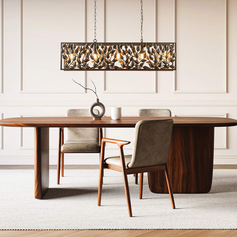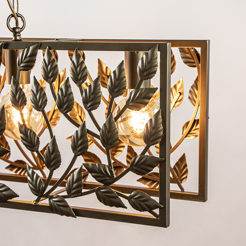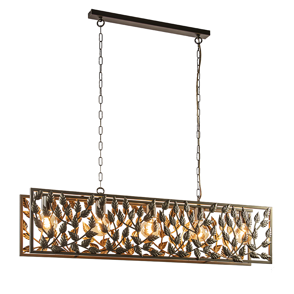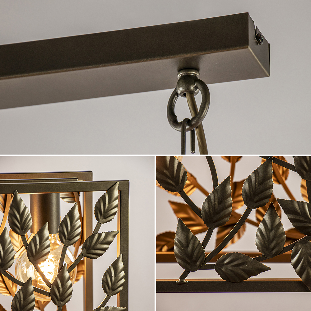 Breng de schoonheid van de natuur naar uw eettafel met deze eettafellamp met een blaadjes-patroon. De lichtbronnen in deze hanglamp zijn omringd door metalen bladeren wat zorgt voor een rustige en gezellige sfeer. Naast het feit dat deze hanglamp robuust is behoudt de lamp zijn elegantie.
