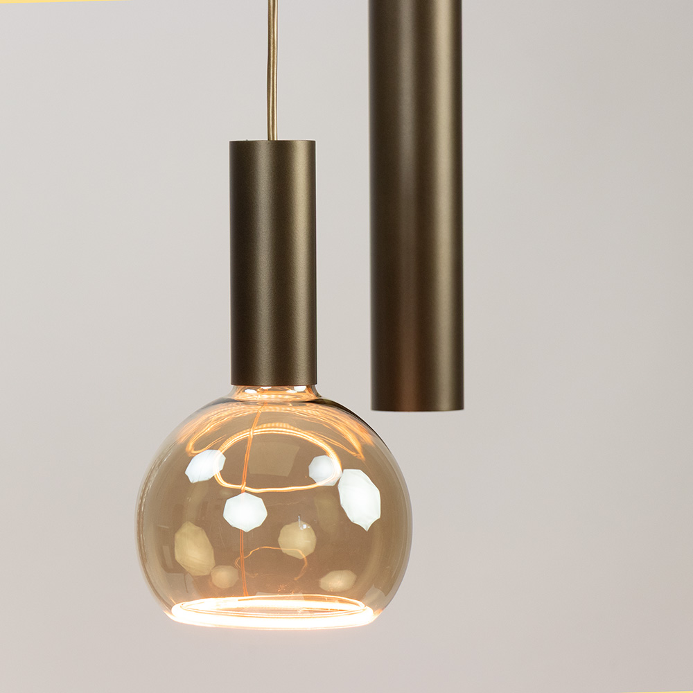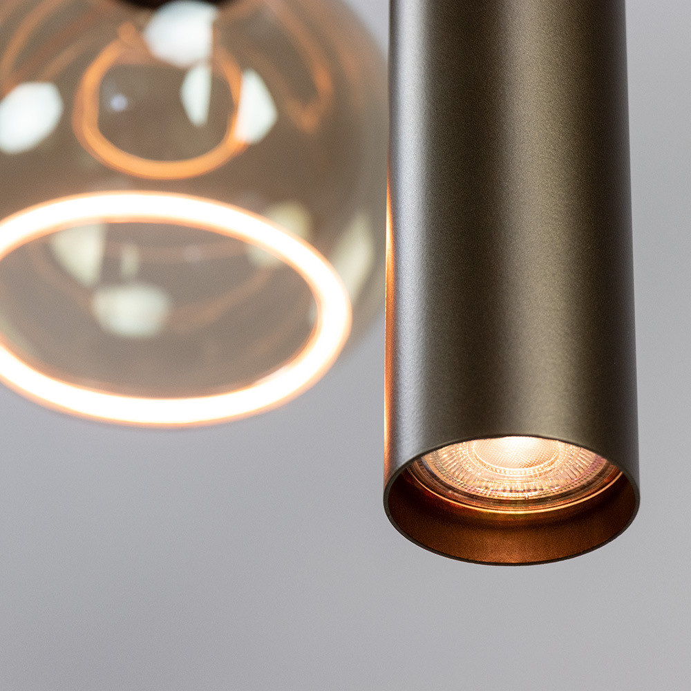 – Afmetingen: ø44x158cm (lxbxh) – Pendel: Ø5×10 cm – Cilinder: Ø5.5×33 cm – Plafondbevestiging: ø44×3 cm – Kleur: brons – Materiaal: metaal – Fittingen: 3x E27 | 2x GU10 (excl. Lichtbronnen) – Dimbaar (excl.)