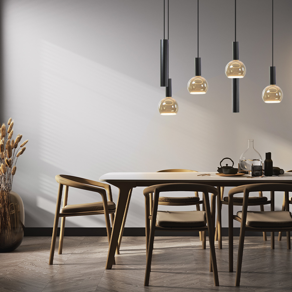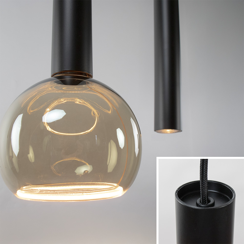 Ontdek deze innovatieve lamp die een modern tintje zal geven aan de eettafel. De afwisseling tussen pendels en cilinders rond de lichtbronnen zorgt voor een moderne uitstraling. Daarnaast draagt deze combinatie bij aan de stijlvolheid van de eetruimte. Uitgevoerd in een zwartte kleur is de lamp ideaal voor bij maaltijden, gezellige diners, en elke gelegenheid waarbij een sfeervolle verlichting gewenst is.