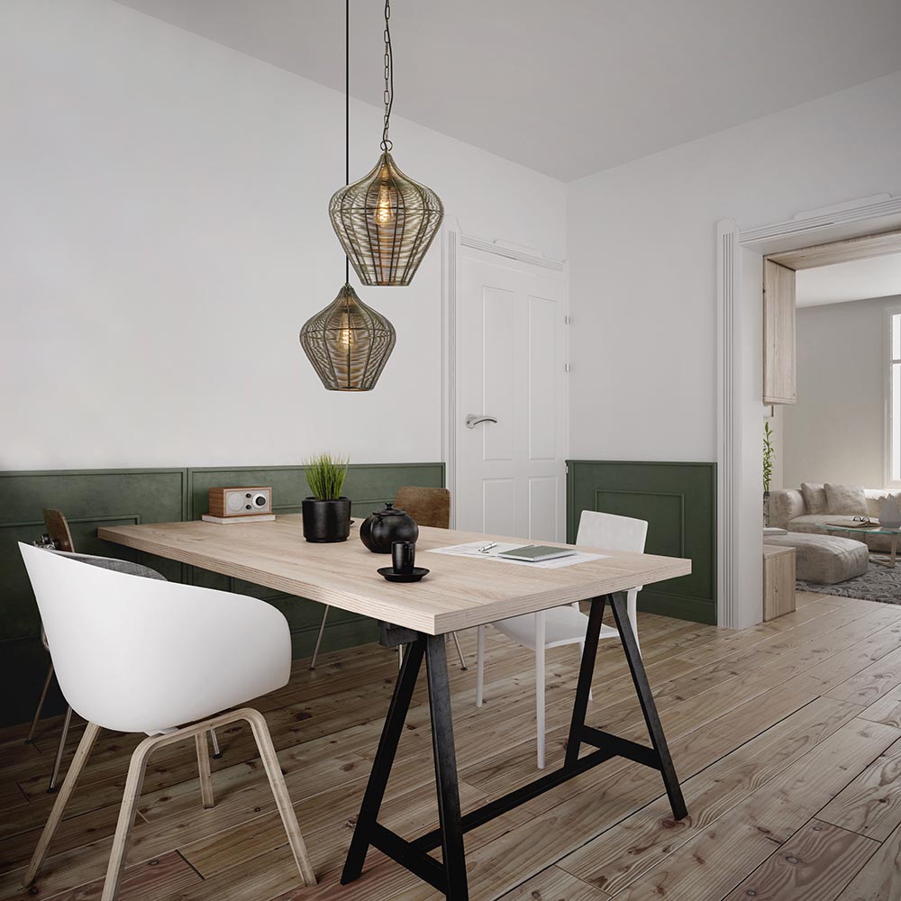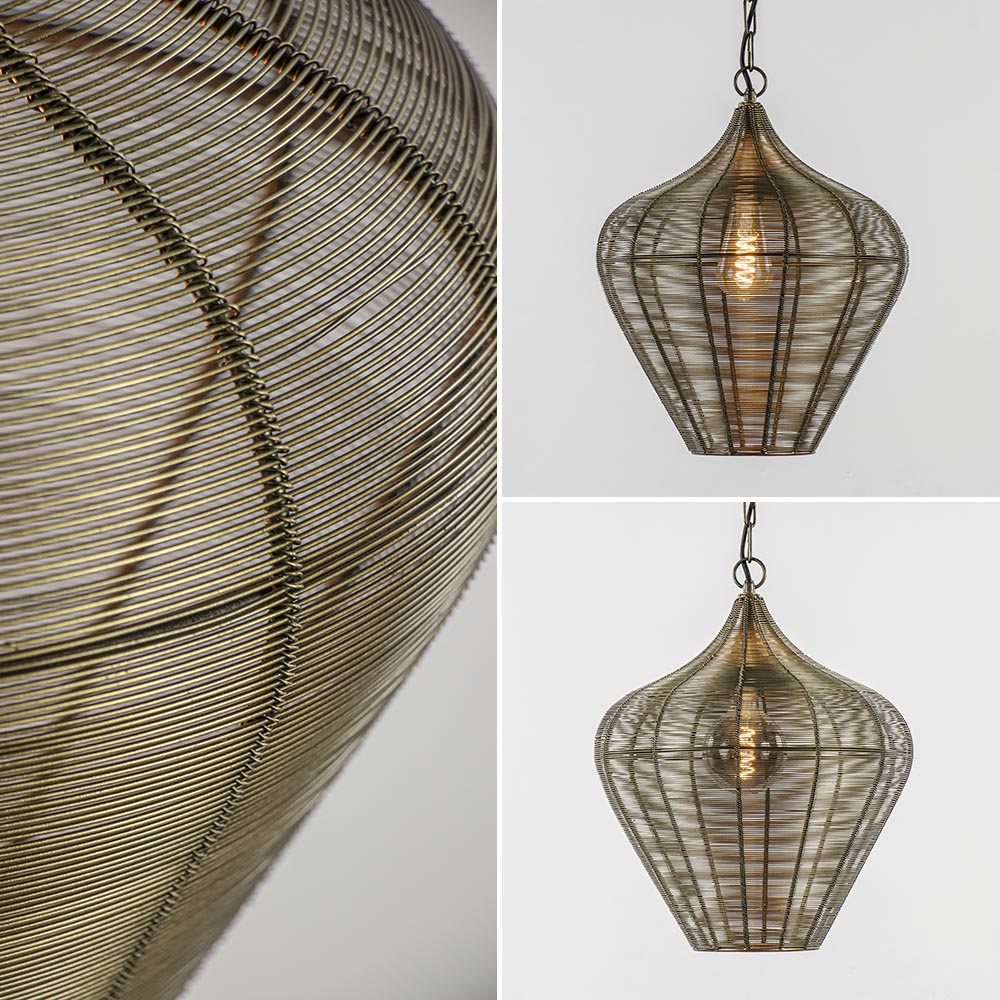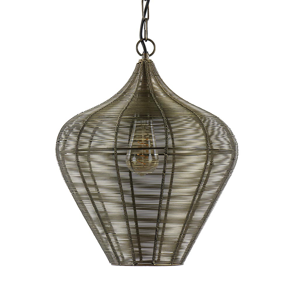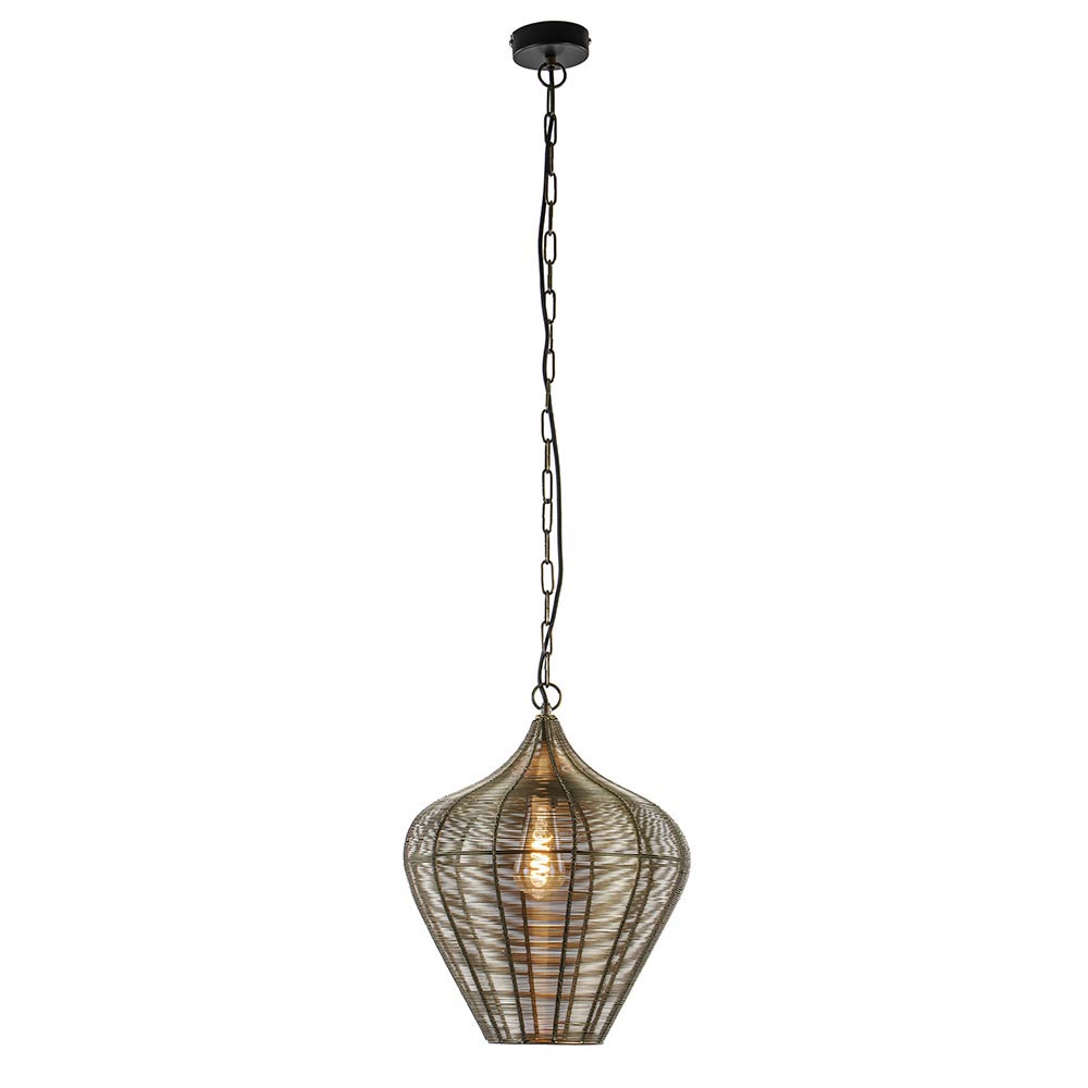 Deze draad hanglamp heeft een warme en gezellige uitstraling. Dit komt door zowel de tulp-vorm als door de antiek afgewerkte brons-kleur van het metaal. Mooi boven een ronde eettafel of met meerdere exemplaren boven een standaard eettafel. In deze lamp is de lichtbron zichtbaar, dus kunt u het beste kiezen voor een decoratieve lichtbron. Mooi in een oosters, klassiek of landelijk interieur. Deze lamp hangt, voor het gewicht aan een ketting met een antiek brons look, voor de stroomtoevoer is de hanglamp voorzien van een zwart stof omwonden snoer.