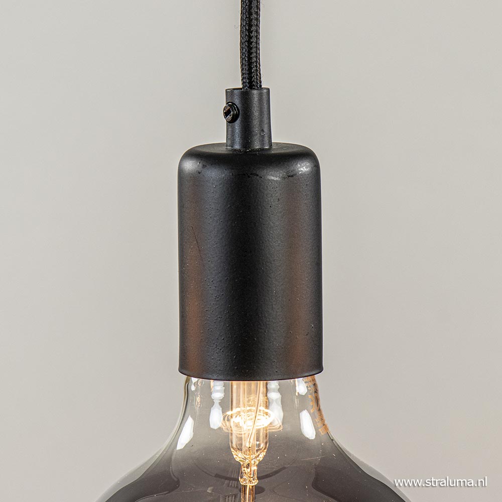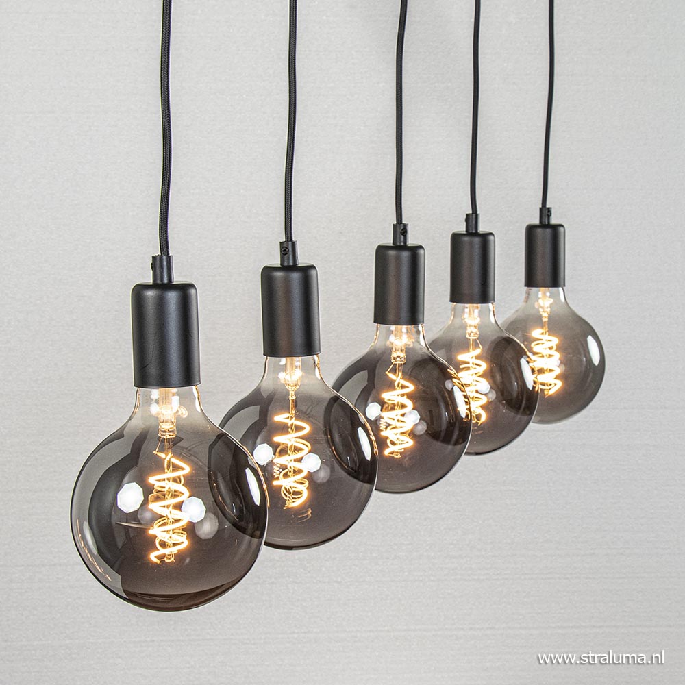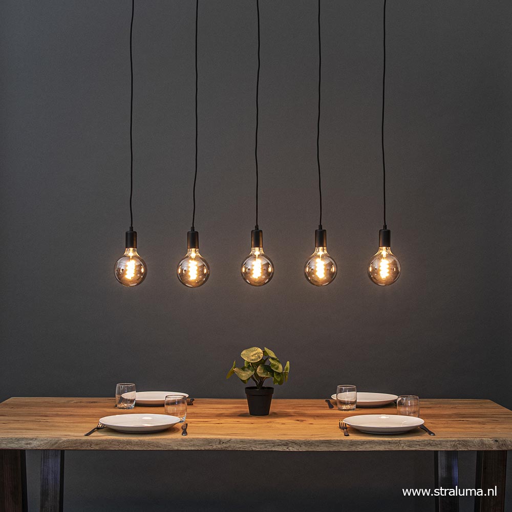 Leuk boven een bar, keuken of gewoon boven de eettafel, deze 5-lichts hanglamp. De lamp geeft ruimte om creatief te zijn met lichtbronnen. Zo kan er worden gekozen voor vijf dezelfde bronnen, maar ook vijf verschillende om een speels effect te geven. Doordat de lamp een vrij neutrale look heeft kan deze worden gecombineerd in vrijwel ieder interieur, maar doet het vooral goed in een industrieel, Scandinavisch of landelijk interieur. De hanglamp heeft zwarte stof omwonden snoeren die in hoogte zijn te verstellen, zwarte armaturen en een zwarte plafondbalk.