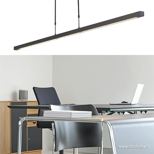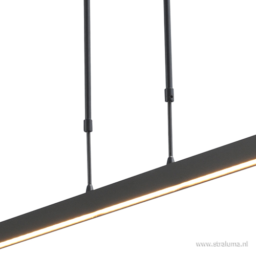 Zeer mooie strakke LED hanglamp. Dit ontwerp is niet nieuw maar wel in deze trendy zwarte kleur. De zwarte balk is uitgevoerd met de nieuwste LED module. Zodra u deze hanglamp dimt met de mooi weggewerkte dimmer op de kop wordt het licht warmer van kleur. Het is een energiezuinige en moderne LED hanglamp die uitstekend geschikt is voor boven een bar, eettafel of bureau. Naast de nieuwste LED techniek is deze hanglamp ook uniek omdat hij zowel verlichting aan de onderzijde heeft maar ook aan de bovenzijde. Het licht schijnt dus twee kanten op.