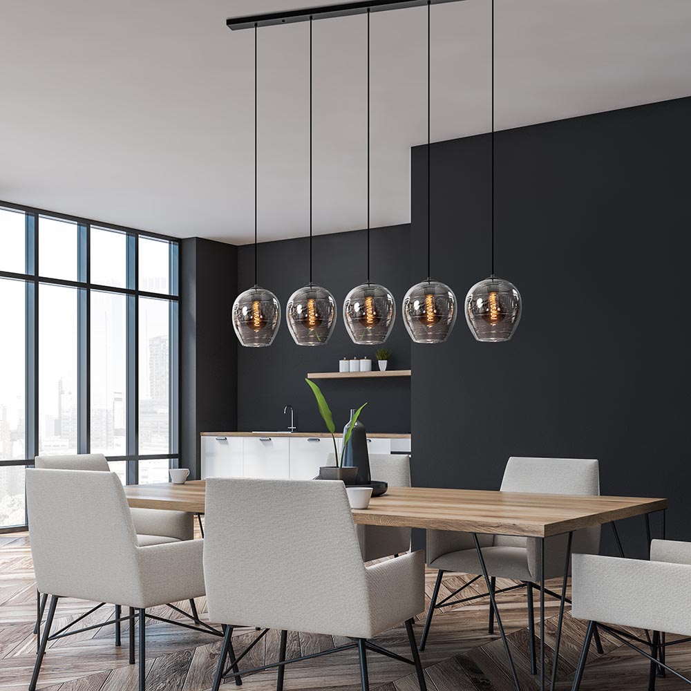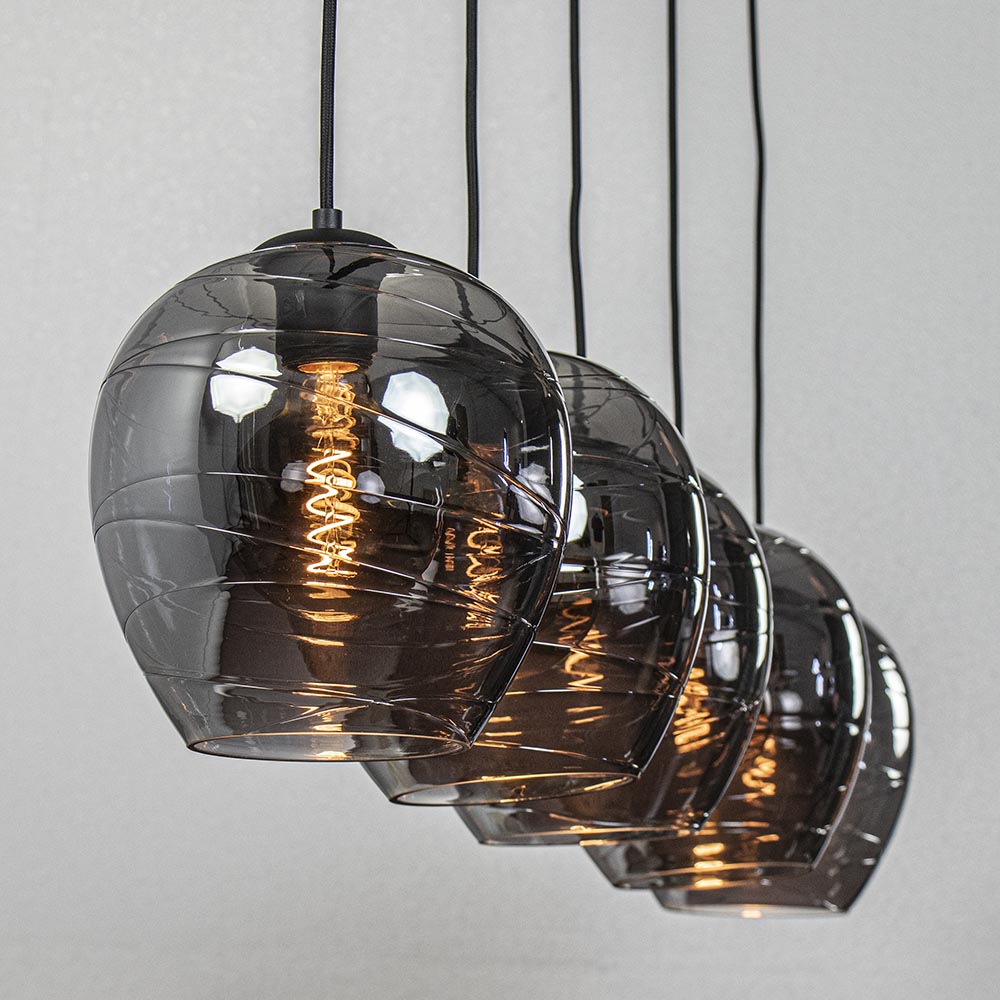 Modern met een chique, luxe uitstraling. Deze 5-lichts hanglamp maakt het interieur helemaal af. De eettafelhanglamp is voorzien 5 smoke glazen kappen met een spiegelend effect. Zodra de lamp is uitgeschakeld spiegeld het glas z’n omgeving, schakelt u de lamp in, dan wordt het glas smoke, oftewel donker transparant. Dit effect zorgt voor de luxe uitstraling van de lamp en wordt versterkt door de vorm van het glas. De smokey glazen kappen hangen aan zwarte stof omwonden snoeren die naar wens zijn in te korten en de luxe hanglamp wordt met een lange plafondbalk van 130 cm aan het plafond bevestigd. De luxe 5-lichts eettafelhanglamp zwart met smoke glas wordt geleverd zonder lichtbronnen (5x E27).
