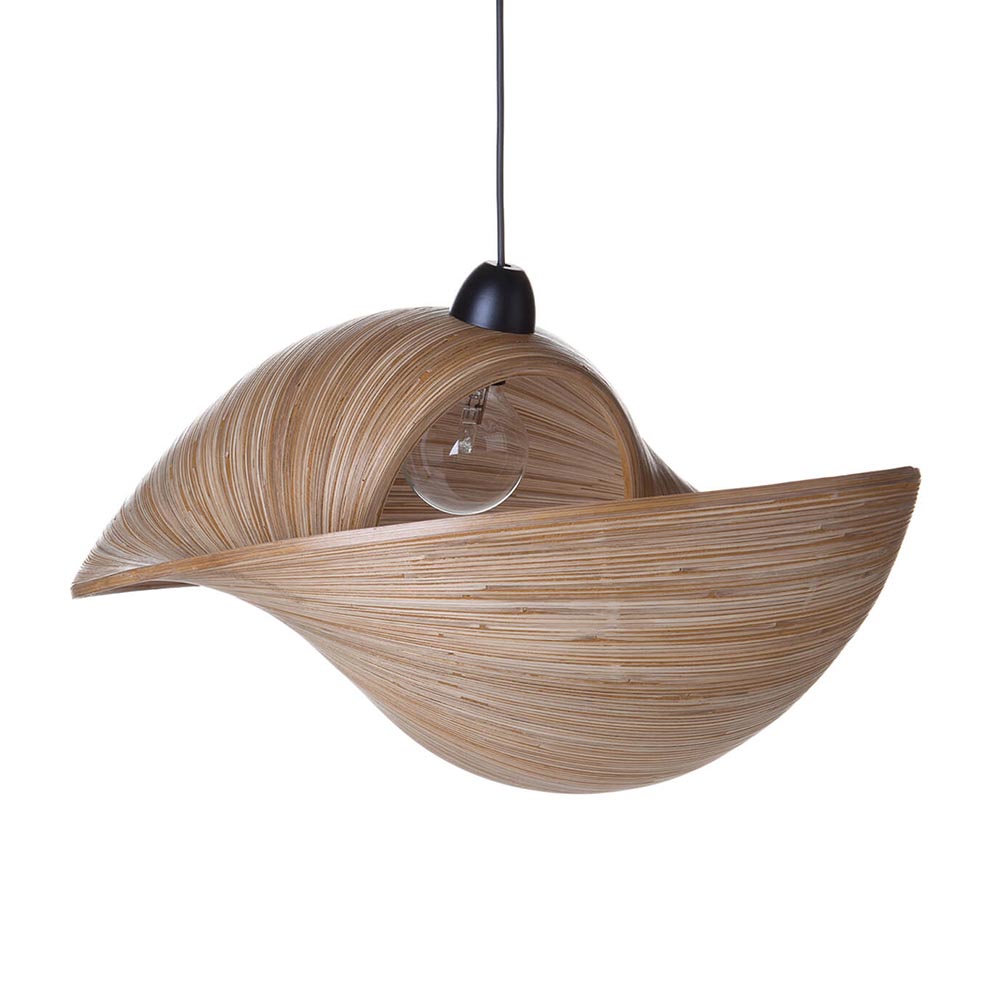 Een uniek design dat een echte eye-catcher is in het interieur. De hanglamp is gemaakt van bamboe en is uitgevoerd in de vorm van een schelp. Doordat de bamboe kap aan twee kanten open is kan het licht mooie verspreiden. Het bamboe heeft een warme sfeervolle tint dat mooi is toe te passen in diverse woonstijlen. Door de grootte van de lamp is deze geschik voor boven de eettafel of in de slaapkamer. De bamboe kap hangt aan een zwart snoer en is naar wens in te korten.