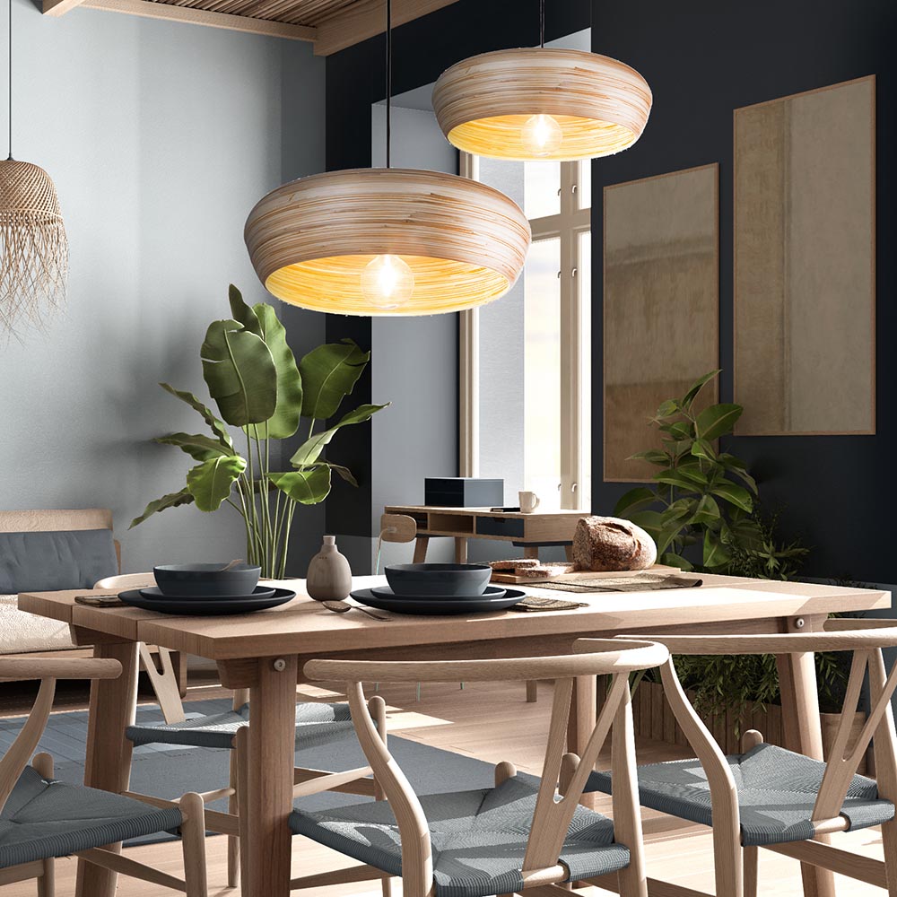 Deze bamboe koepel hanglamp past mooi bij een beach of botanisch interieur. De ronde hanglamp past vanwege z’n formaat prima boven een ronde eettafel of in de slaapkamer. De bamboe kap hangt aan een zwart snoer welke naar wens is in te korten. Het bamboe geeft een warme sfeervolle uitstraling aan het interieur. De hanglamp wordt geleverd zonder lichtbron (E27).