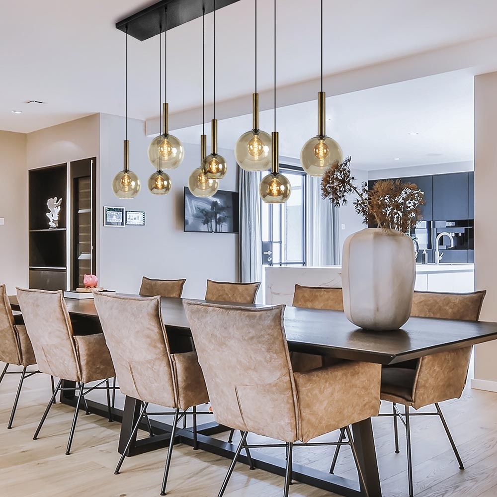 Deze multipendel is werkelijk een verrijking voor uw eetkamer. Deze luxe hanglamp is voorzien van 8 smoke glazen bollen verdeeld over 3 maten. De diverse maten zorgen voor een mooie verdeling en geven samen met het donkere glas net een beetje extra luxe. De ronde glazen zijn bevestigd op cilinder-vormige metalen pendels. Deze zijn uitgevoerd in het brons wat de hanglamp een mooi geheel maakt. De snoeren zijn naar wens in te korten zodat u de lamp zo kunt hangen dat hij het beste uitkomt boven uw eettafel. De grote eettafelhanglamp is dimbaar met de juiste dimmer en wordt geleverd zonder lichtbronnen (8x E27).