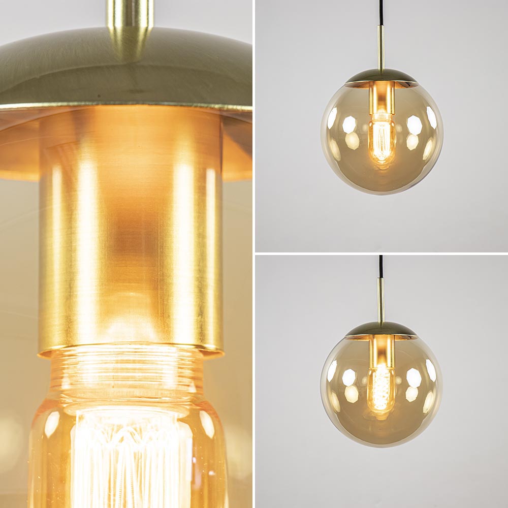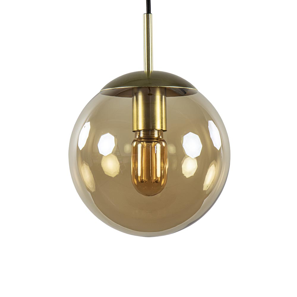 Een prachtige toevoeging voor een hal, woonkamer of slaapkamer. Deze hanglamp bol zorgt in ieder geval voor sfeer, waar deze ook hangt. De hanglamp bestaat uit een amber glazen bol die is afgewerkt met een messing kap en fitting. Het ronde glas hangt aan een zwart stof omwonden snoer die naar wens is in te korten. De maximale hoogte van de lamp is 160 cm. De hanglamp met amber glazen bol wordt geleverd zonder lichtbron (E27).