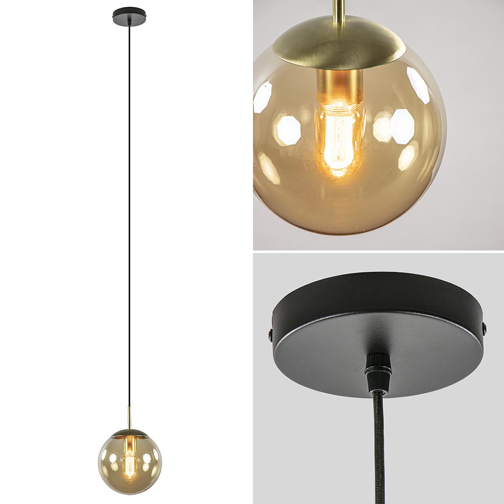 – afm: Ø20×160 cm – bevestiging: Ø12×2,5 cm – kap: Ø20 cm – amber glas – metaal, messing/zwart – in hoogte verstelbaar – exclusief lichtbron (E27) – dimbaar (exclusief)