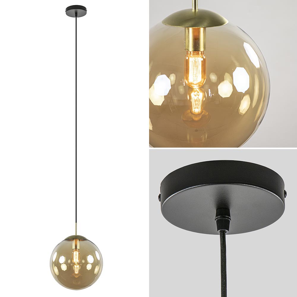– afm: Ø30×170 cm – bevestiging: Ø12×2,5 cm – kap: Ø30 cm – amber glas – metaal, messing/zwart – in hoogte verstelbaar – exclusief lichtbron (E27) – dimbaar (exclusief)