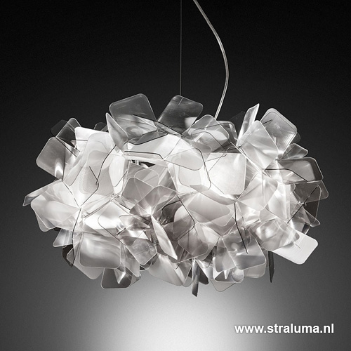 Prachtig Italiaans design en vervaardigd van hoogwaardig kunststof. Deze prachtige design hanglamp is als een wolk van licht. Hij neemt bezit van de ruimte, en geeft deze een heel nieuw karakter. De elementen lijken volledig willekeurig samegesteld, maar volgen een zeer precieze compositie. Deze sprankelende design lamp heeft een mooie balans van transparant en semi-transparant, in een fantastische rookkleur. De lamp hangt met een transparant snoer en staalkabel aan de witte plafondbevestiging.
