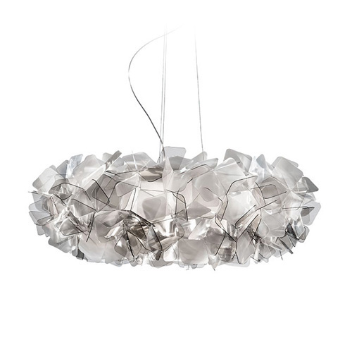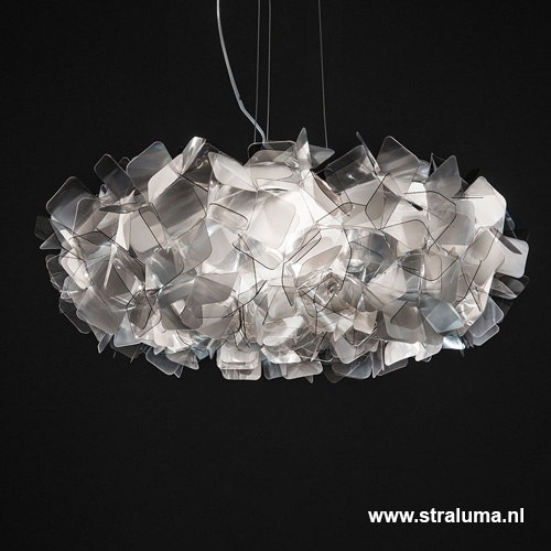 Groter is beter. Dat geldt zeker voor deze prachtige design hanglamp. Een hanglamp als een grote wolk van licht. Hij neemt bezit van de ruimte, en geeft deze een heel nieuw karakter. De elementen lijken volledig willekeurig samegesteld, maar volgen een zeer precieze compositie. Deze design lamp heeft een mooie balans van transparant en semi-transparant. De grote hanglamp hangt met een transparant snoer en 3 staalkabels aan de witte plafondbevestiging. De lamp heeft een prachtige rookkleur.