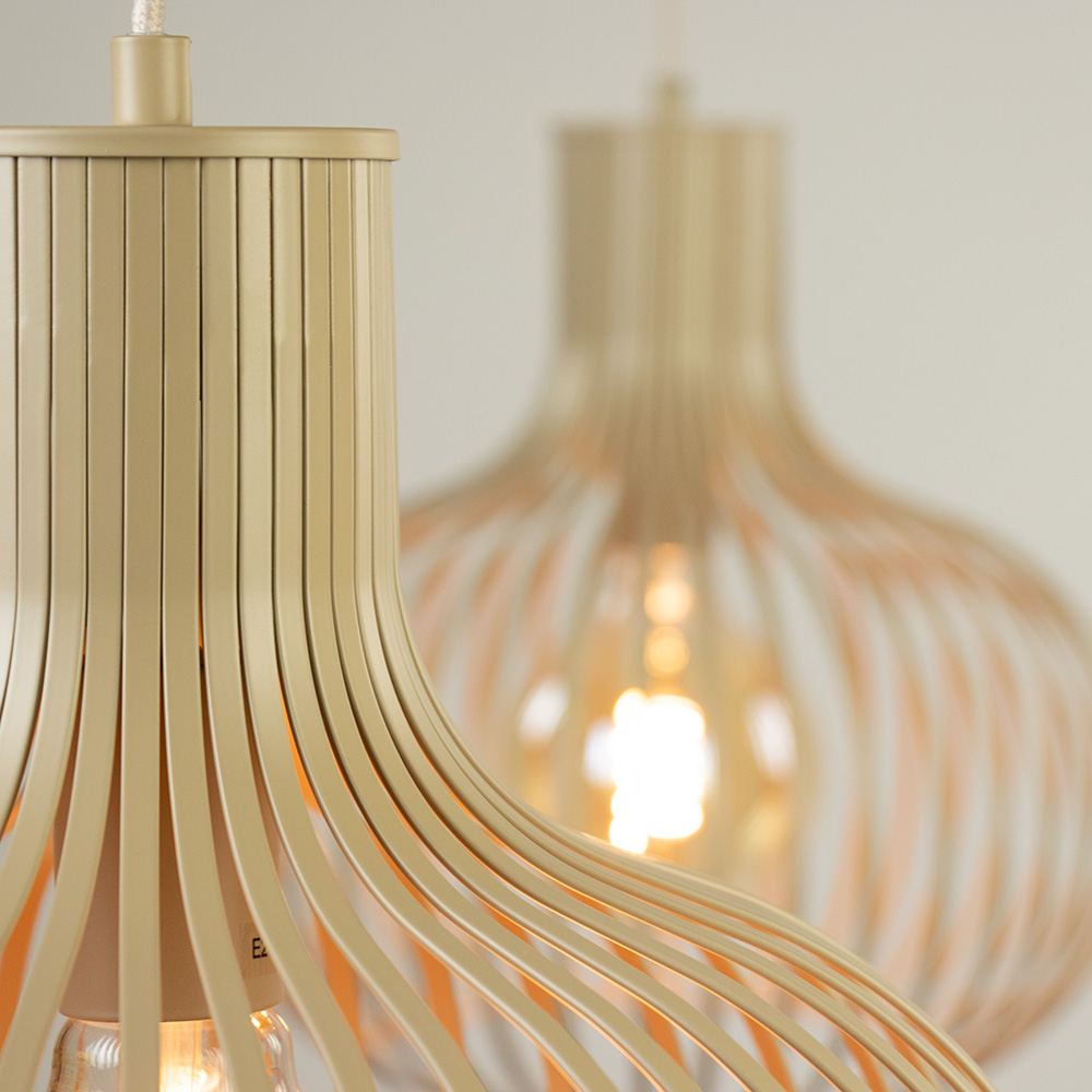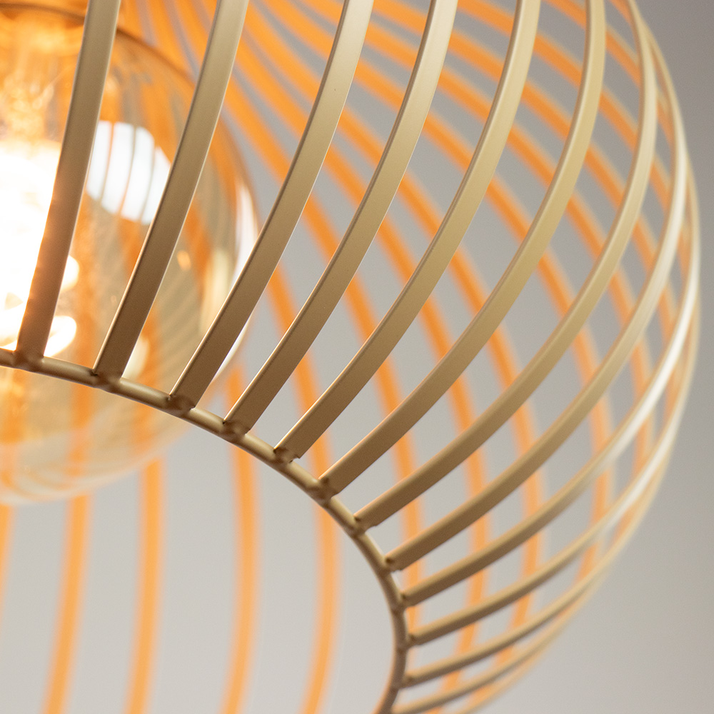 Stijlvol, luchtig en modern: hanglamp Daria is een echte eyecatcher. Deze prachtige 2-lichts hanglamp brengt warmte en elegantie in jouw interieur. De lampenkappen zijn gemaakt van verfijnde, beige metalen lamellen die samen een sierlijke, organische vorm creëren. Dankzij de open structuur ontstaat een speels lichteffect op muur en plafond. De zichtbare filamentlampen geven de lamp een subtiele industriële twist.