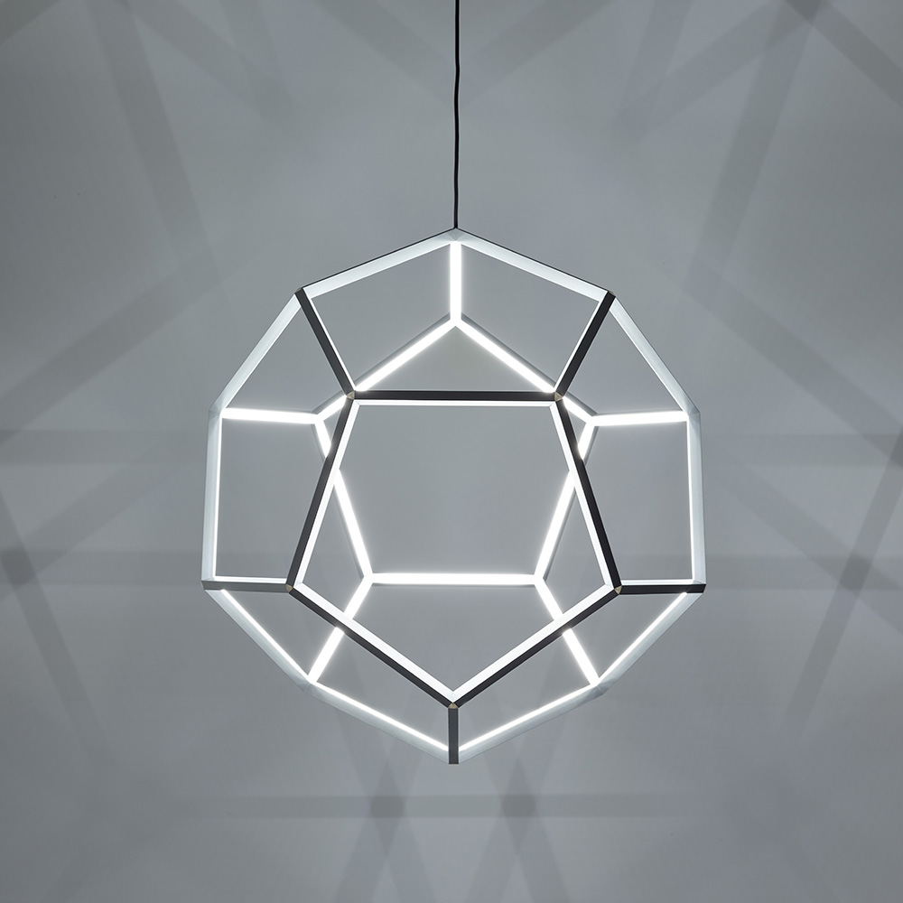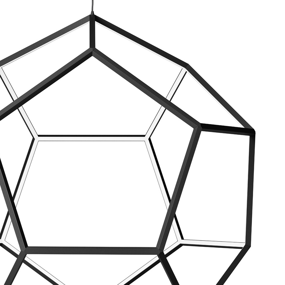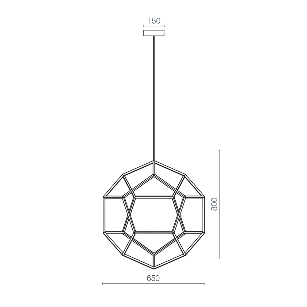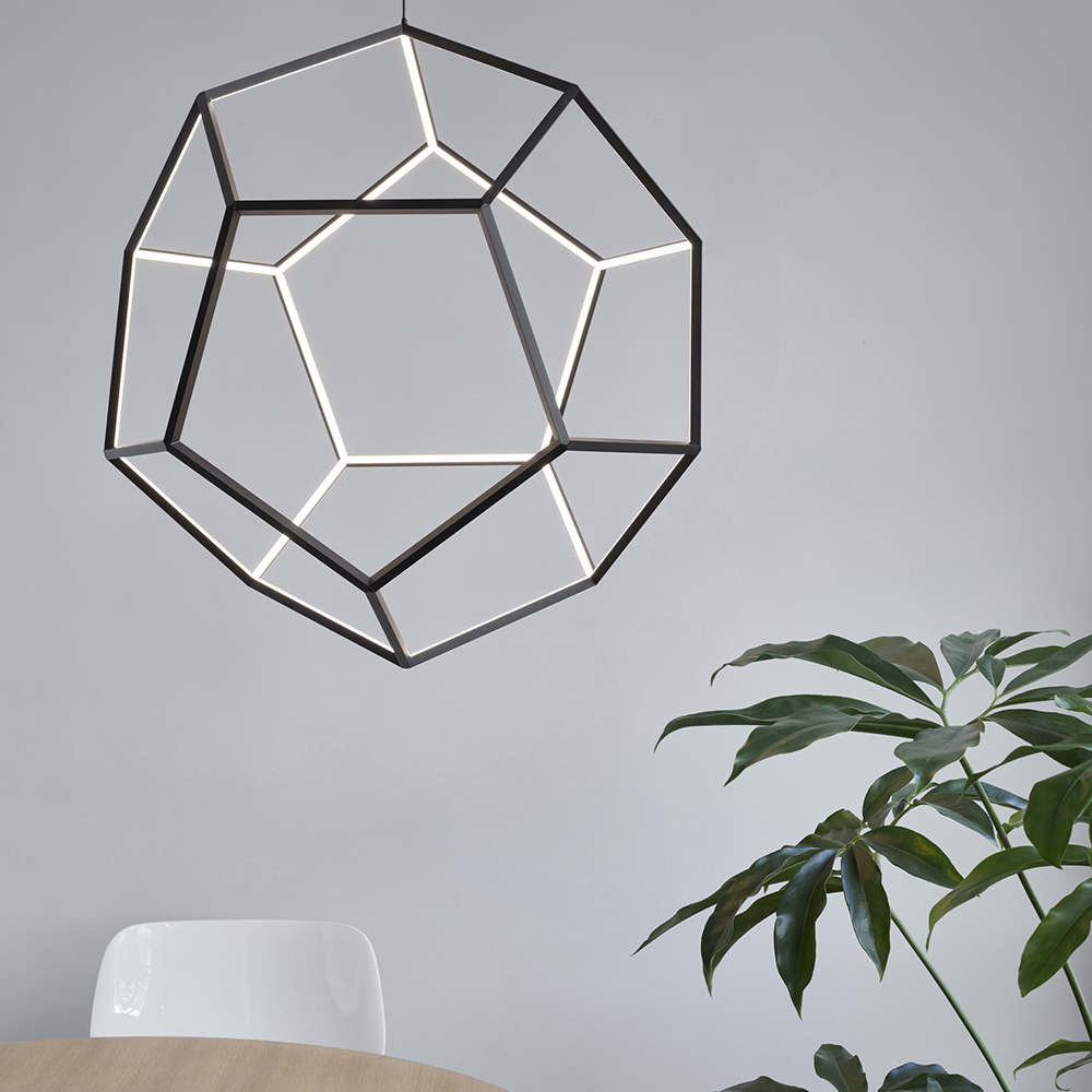 Geïnspireerd op de wiskundige vorm van een dodecaëder, maakt deze moderne hanglamp tot een waar schouwspel in de ruimte. De abstracte vorm en openheid van de lamp zorgt voor een luchtig geheel en maakt de lamp een met de ruimte. Het smalle frame van deze 12 vlakkerige kap behuist een LED strip die zorgt voor een mooi schouwspel aan licht. Doordat de lamp meerdere kanten op verlicht ontstaat er een prachtig lijnenspel aan schaduwen in de ruimte. De kap heeft een afmeting van 65×80 cm wat de lamp prima geschikt maakt voor boven een eettafel of in een vide. De moderne LED hanglamp is in hoogte verstelbaar en dimbaar middels een externe dimmer.