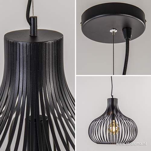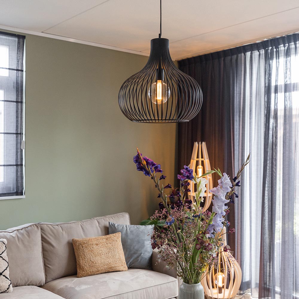 Sfeervol boven de eetkamertafel, alleen of per twee, maar ook leuk in de woon- of slaapkamer. Kies de juiste lichtbron om de perfecte sfeer te creëren, de open structuur zorgt namelijk dat er veel licht kan worden verspreid. De metalen draad hanglamp heeft een ronde vorm die van onder open is en komt aan de bovenzijde van de kap samen. De kap hangt aan een staaldraad en heeft zwart stofomwonden snoer, beide zijn in hoogte te verstellen en wordt met een ronde bevestiging aan het plafond opgehangen. Doordat beide snoeren veel lengte hebben past de draadlamp prima in een ruimte met een hoog plafond. De lamp heeft een moderne look, maar past ook prima in een landelijk of Scandinavisch interieur.