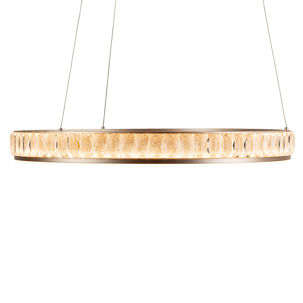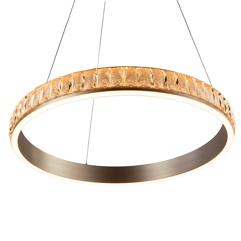 Breng een vleugje luxe in je interieur met deze stijlvolle ronde hanglamp. De ringvormige armatuur is rondom afgewerkt met geslepen imitatie kristalglal, wat zorgt voor een schitterend lichtspel zodra de lamp wordt ingeschakeld. De geïntegreerde LED-lichtbron straalt warm wit licht uit en creëert een elegante sfeer boven een eettafel, kookeiland of in de hal.