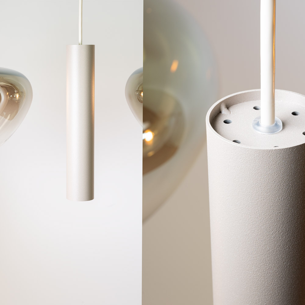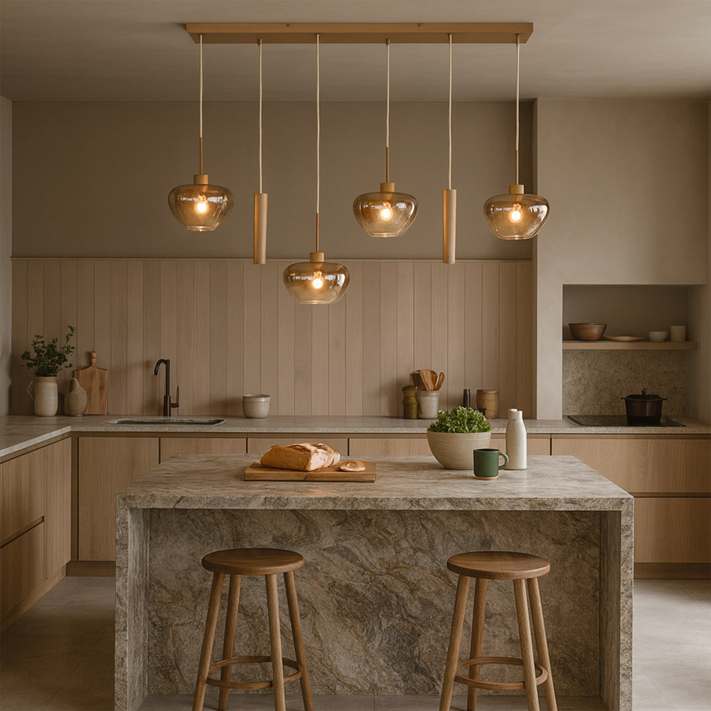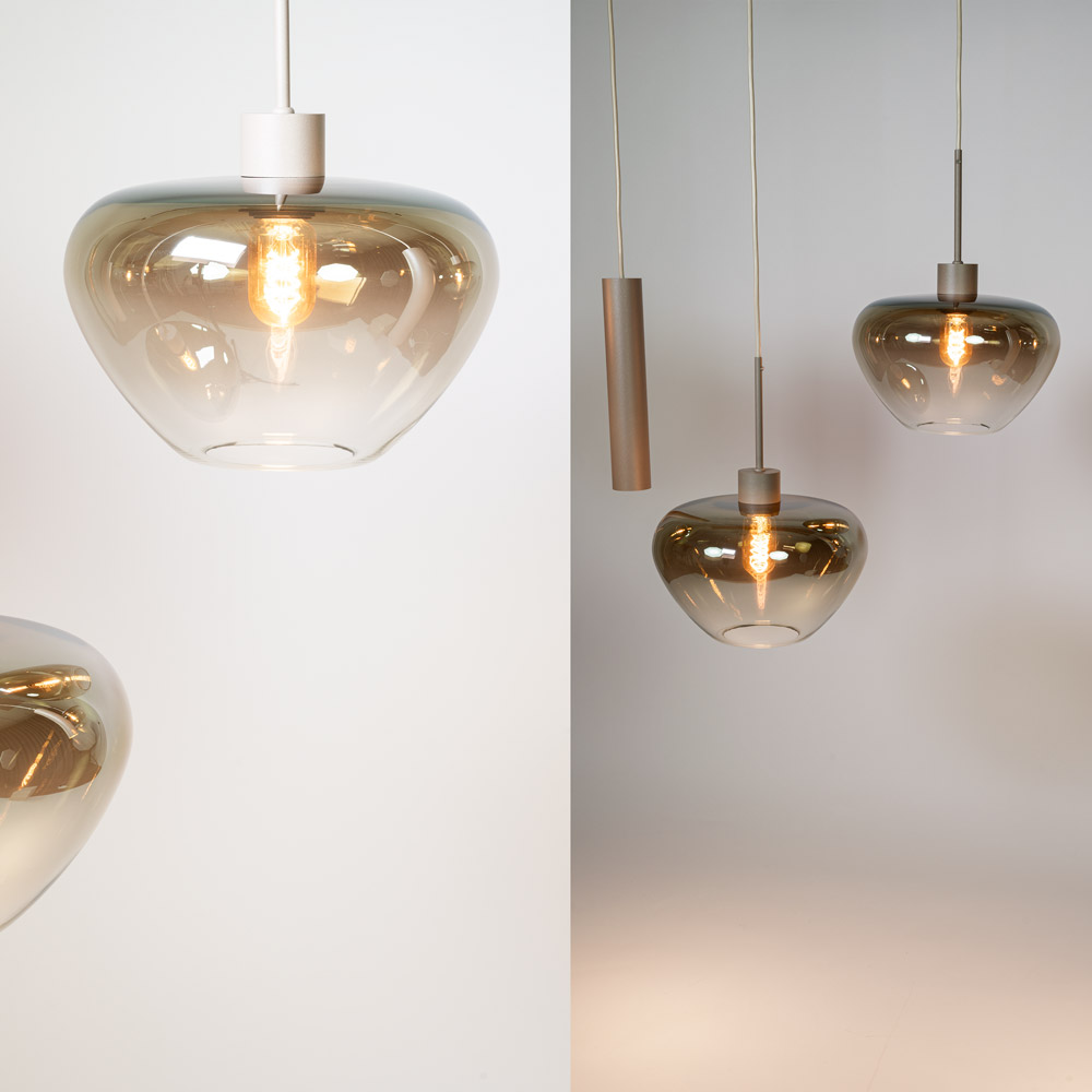 De glazen kappen verspreiden een warme, uitnodigende gloed, terwijl de GU10-pendels ideaal zijn om extra licht te richten op bijvoorbeeld een eettafel of kookeiland. Dankzij de variërende hoogtes ontstaat een luchtig en dynamisch geheel dat perfect tot zijn recht komt boven een grote eettafel van circa 200–240 cm of een ruim kookeiland.