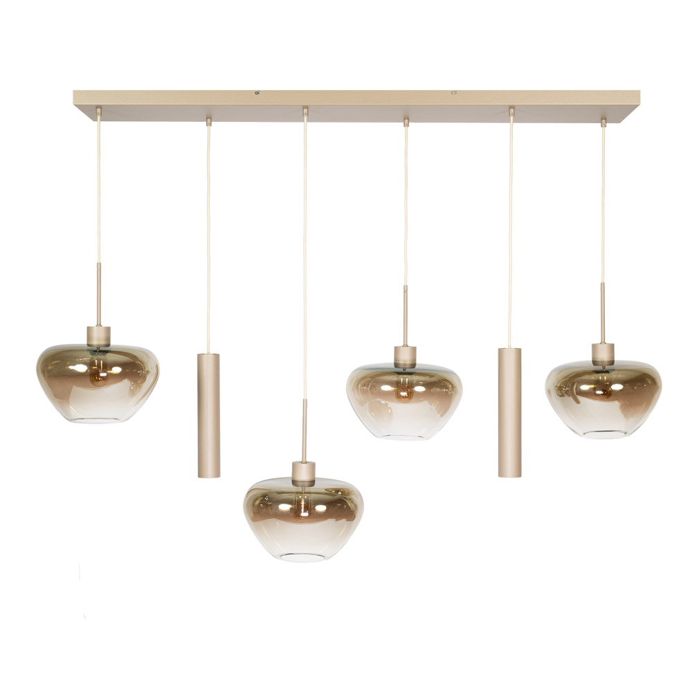 De Genua Balk 6L is een stijlvolle en royale hanglamp die direct sfeer en karakter toevoegt aan de ruimte. Deze uitvoering bestaat uit een langwerpige plafondplaat met zes speels verdeelde pendels: vier amberkleurige glazen kappen met E27 fitting en twee slanke cilinderpendels met GU10 fitting. Deze combinatie zorgt voor een prachtig samenspel tussen sfeervol diffuus licht en gericht functioneel licht.