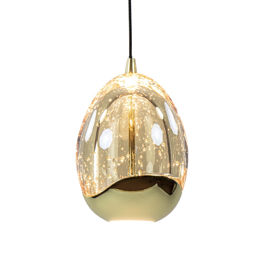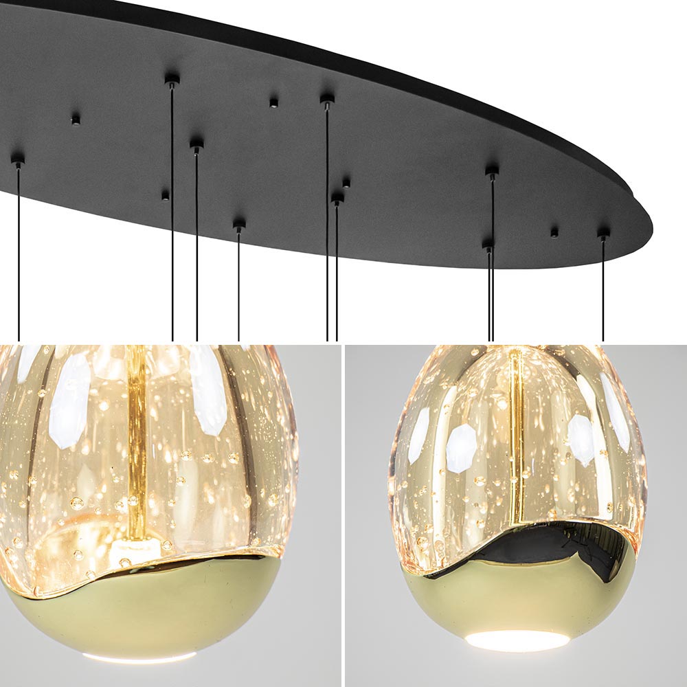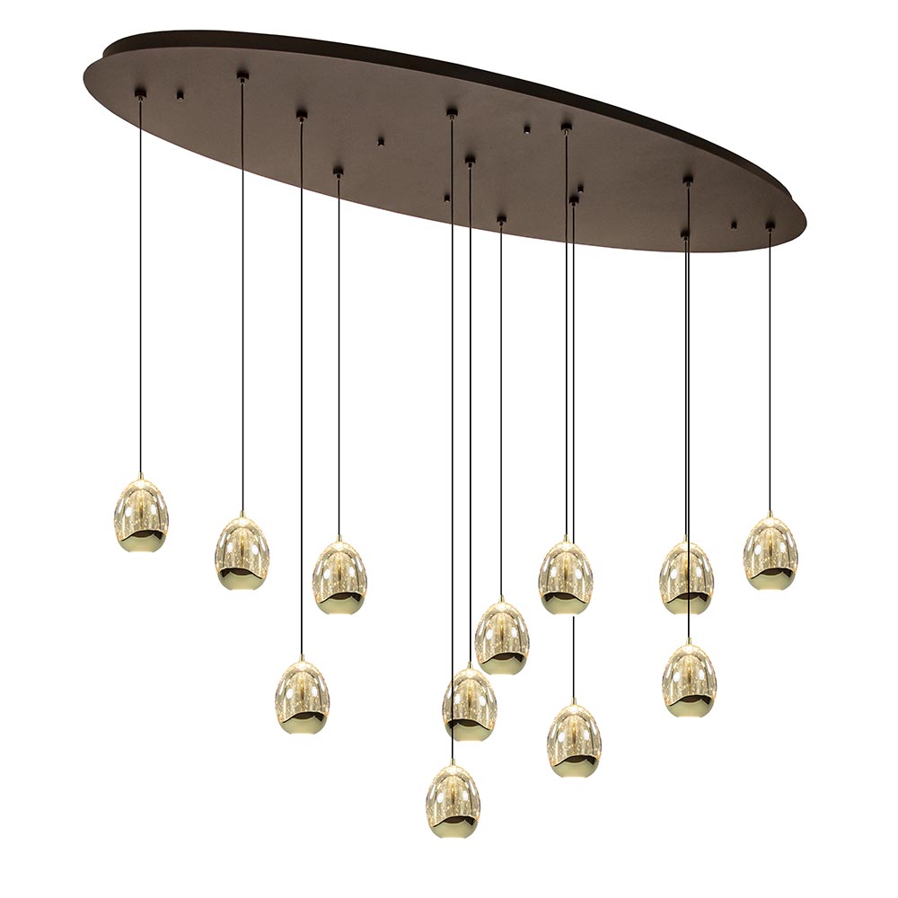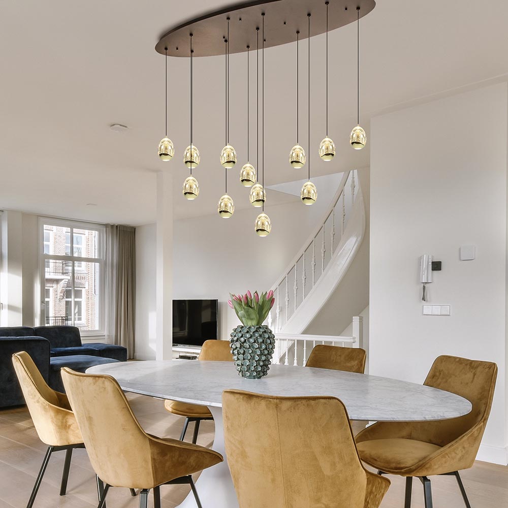 Eieren voor uw geld? Dat kan nu letterlijk met deze moderne hanglamp. De kappen zijn gevormd als een ei en voorzien van LED verlichting. De kap is deels van massief glas en deels van metaal dat is uitgevoerd in glanzend goud. Dit geeft de kap een luxe uitstraling. Het glas is voorzien van belletjes wat een mooi effect geeft wanneer de lamp wordt ingeschakeld. De verlichting geeft direct licht naar beneden dmv de spot onderop het ei, en daarnaast ook indirect licht door het licht binnenin het ei. De 12 kappen zijn gemakkelijk naar wens op hoogte te hangen dmv een trekontlaster. De 12-lichts hanglamp wordt opgehangen met een mat zwarte ovale plafondplaat.