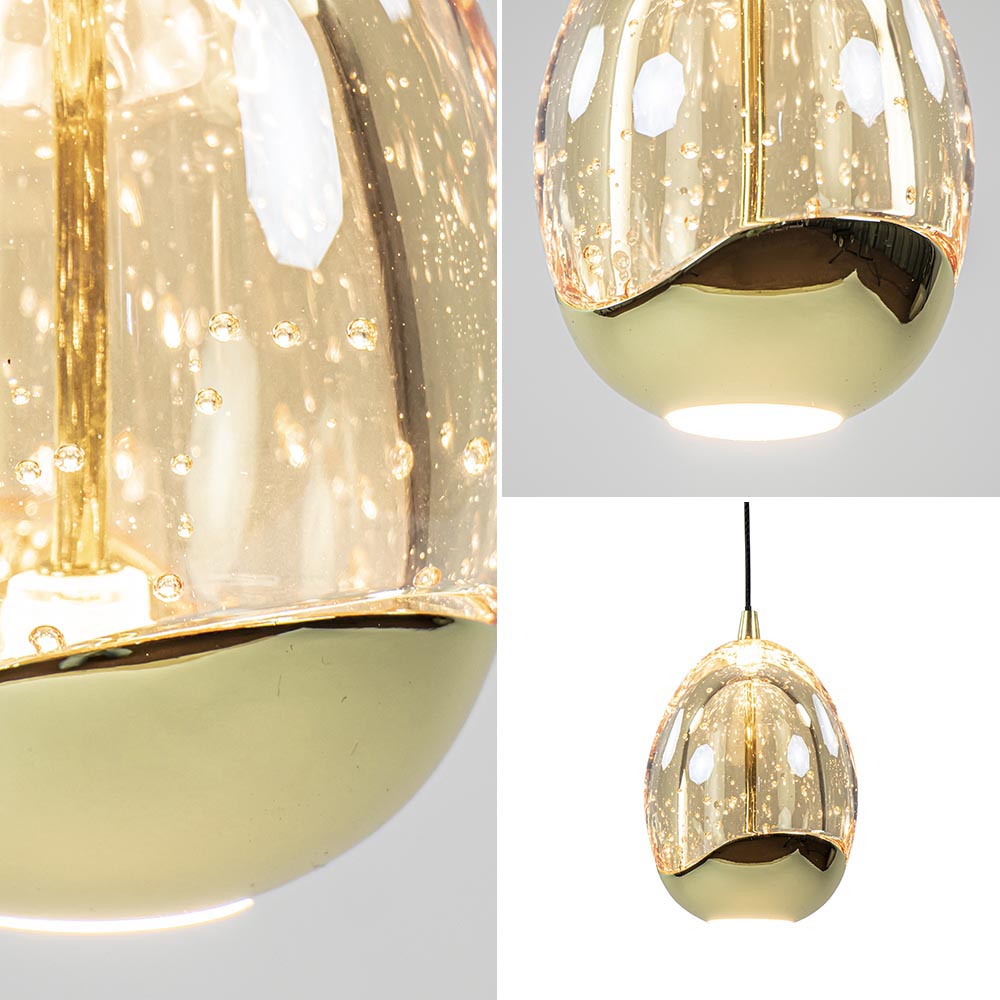 Een sfeervolle toevoeging voor boven een bijzettafel of boven een nachtkastje. De kap is gevormd als een ei en voorzien van LED verlichting. De kap is deels van massief glas en deels goudkleurig metaal. Dit geeft de lamp een luxe uitstraling. Het glas is voorzien van luchtbelletjes wat de hanglamp een speels effect geeft. De verlichting geeft direct licht naar beneden door middel van de spot onderop het ei, en daarnaast ook indirect licht doordat het ei van binnenuit verlicht wordt. De hanglamp is gemakkelijk in te nemen mocht deze te hoog zijn. De hanglamp is dimbaar middels een externe LED dimmer (exclusief).
