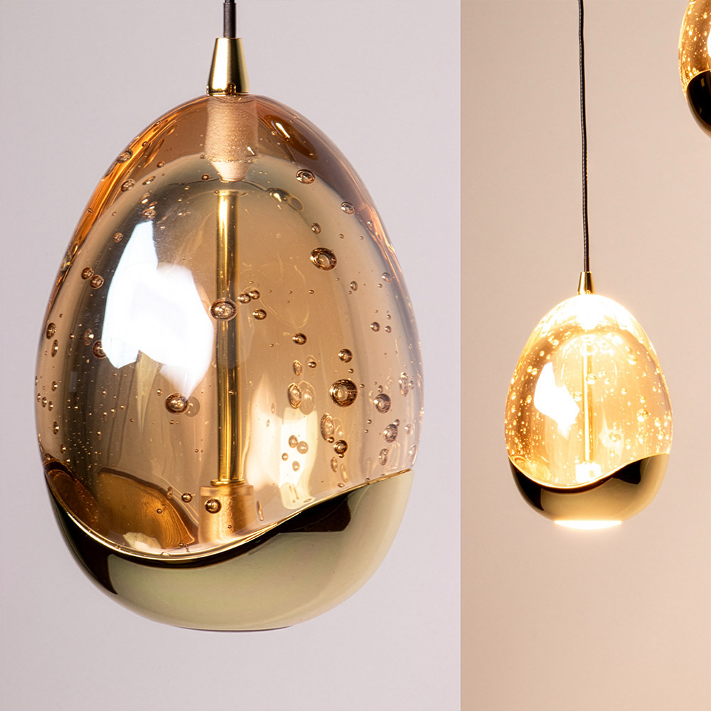 De Gouden Ei hanglamp is een echte blikvanger boven je eettafel of in de hal. Deze 3-lichts lamp combineert glanzend goudkleurig glas met subtiele luchtbelstructuren, wat zorgt voor een luxe en speelse uitstraling. De goudtint van de kappen weerspiegelt het licht op een warme manier, waardoor elke ruimte direct sfeer krijgt.