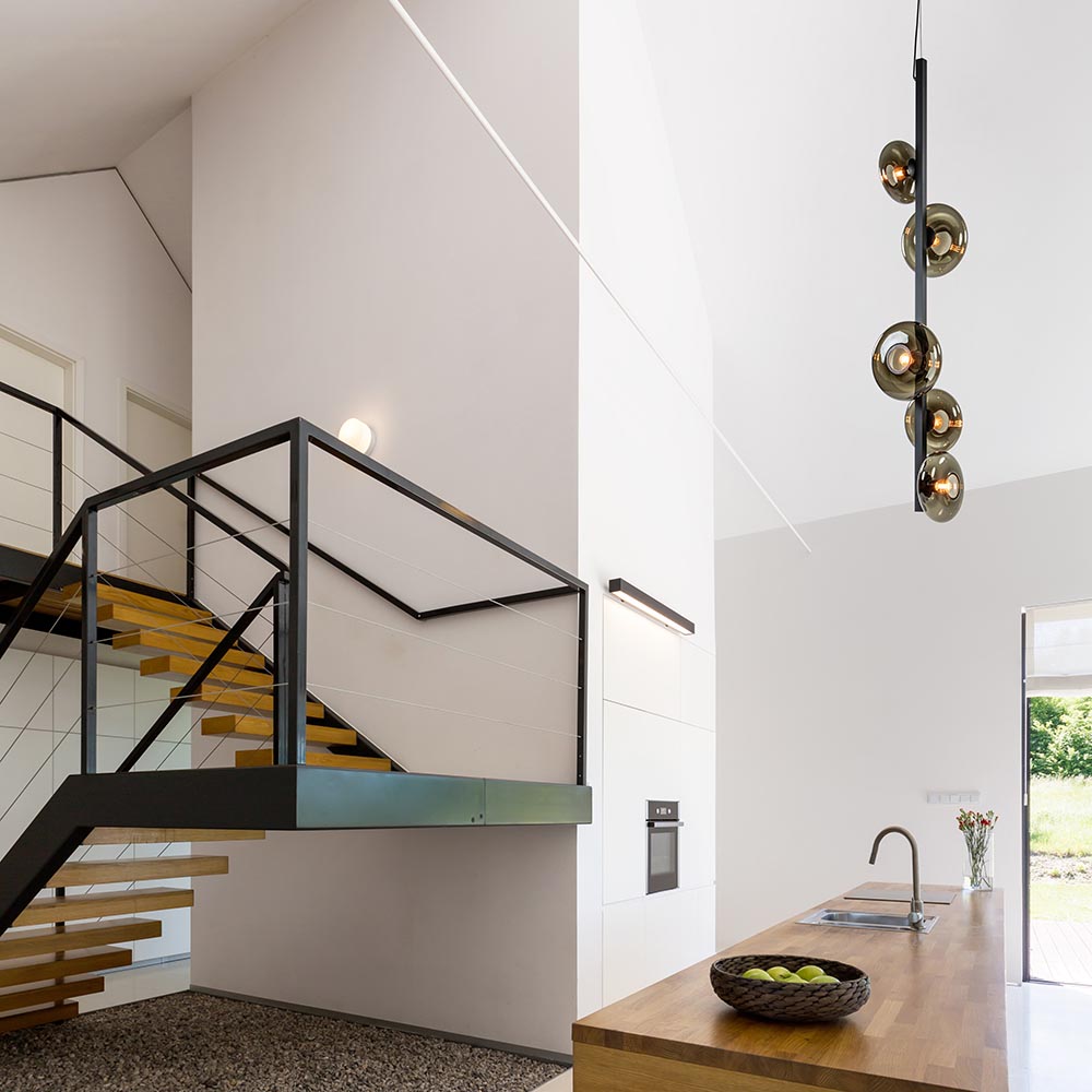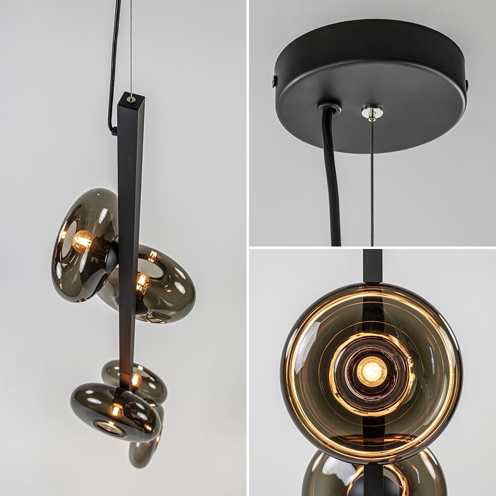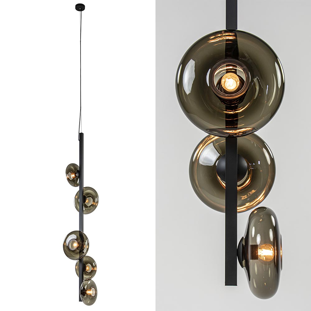 Deze langwerpige hanglamp is een mooie eyecatcher voor een vide. De lamp heeft een speels design die bestaat uit een mat zwarte metalen balk waar 5 lichtpunten op zijn verwerkt. Ieder punt ondersteund een ronde smoke glazen kap die zijn verdeeld over 2 afmetingen. Het donkere glas zorgt voor een fijne sfeer en geeft een luxe uitstraling aan de ruimte. De smoke glazen hanglamp heeft een hoogte van 310 cm, waarvan de kap zelf 160 cm is. De grote kap hangt aan een staaldraad en een zwart snoer die beide naar wens zijn in te korten. De videlamp wordt geleverd zonder lichtbronnen (5x E27).