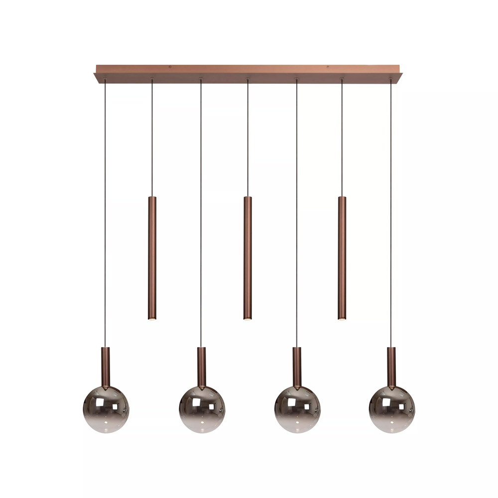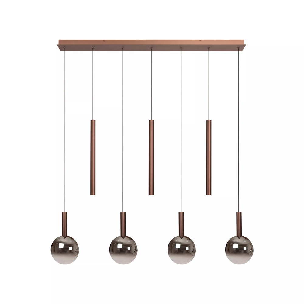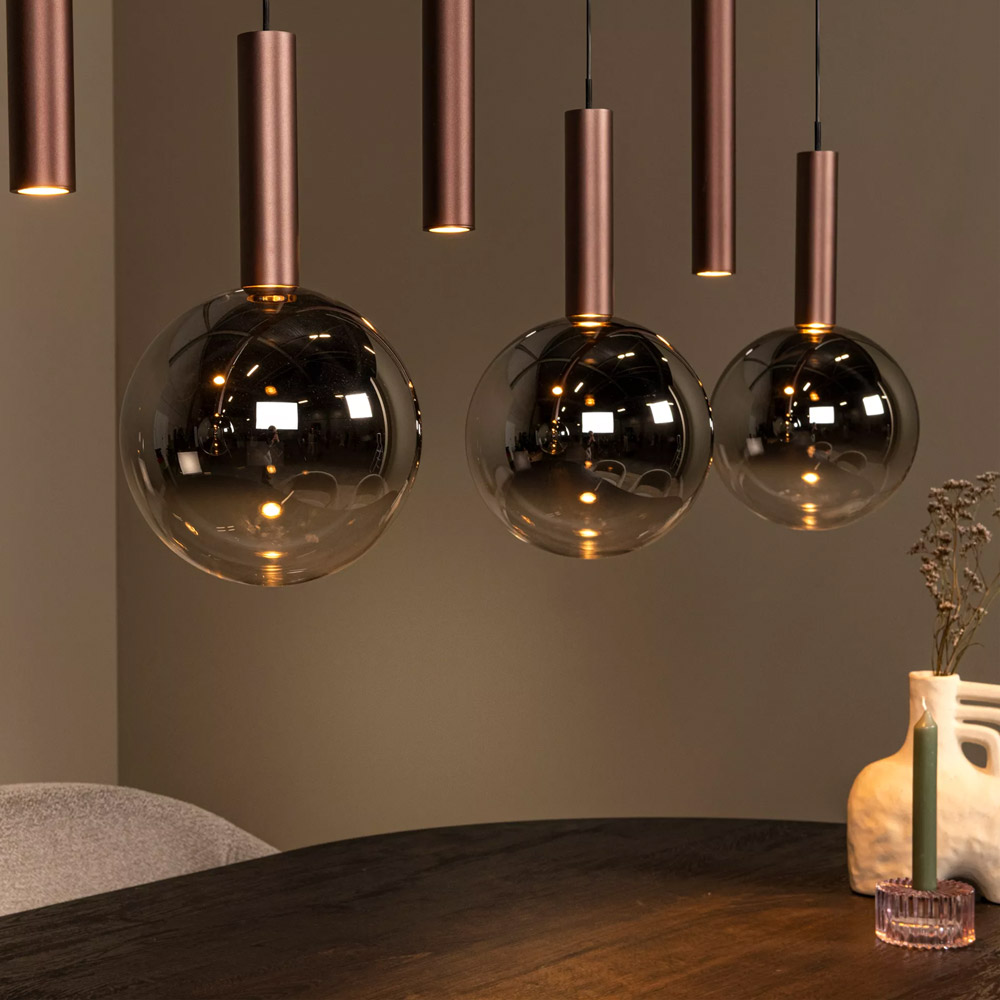 Specificaties: • Kleur: Koper met fumé accenten • Vorm: Rechthoek • Totale lamp: H 100–218 cm × L 137 cm × B 18 cm • Bevestigingsplaat: H 4 cm × L 125 cm × B 10 cm • Kap per stuk: H 25 cm × Ø 3,5 cm • Materiaal: Aluminium • Kabelkleur: Zwart (lengte 210 cm) • Lichtbron: 7 x geïntegreerde LED • Wattage: 7 x 4W • Lumen: 7 x 360 lm • Lichtkleur: Instelbaar 2200K – 3300K • Dimbaar: Ja, via externe wanddimmer (niet inbegrepen)