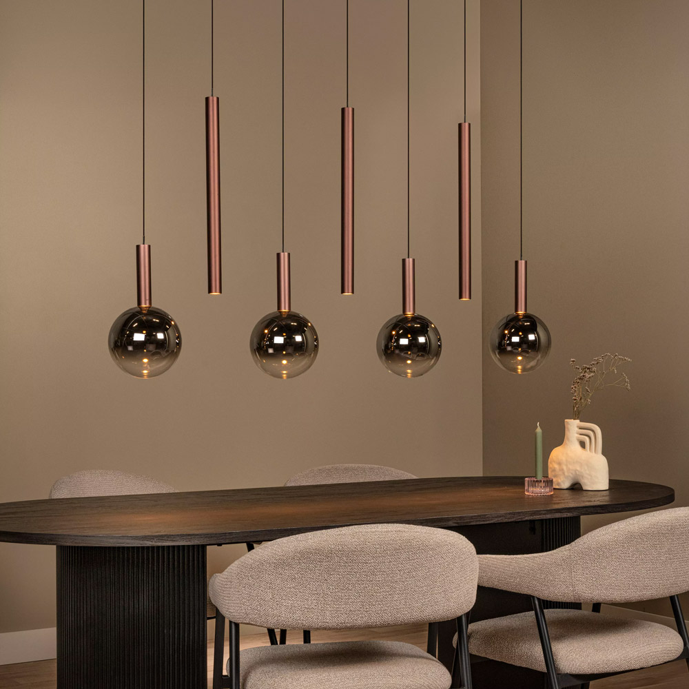 Deze slanke rechthoekige hanglamp combineert verfijnd design met warme luxe. De zeven smalle aluminium pendels hangen speels onder de langwerpige plafondplaat en zorgen voor een zachte, diffuse lichtverdeling rondom. De koperkleurige afwerking in combinatie met subtiele fumé details geeft de lamp een stijlvolle, moderne uitstraling die moeiteloos past boven een eettafel of kookeiland.