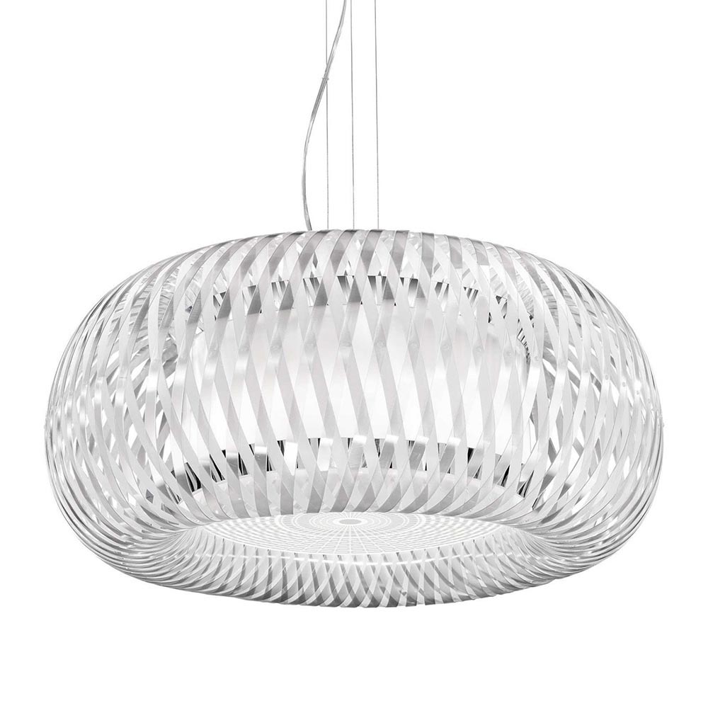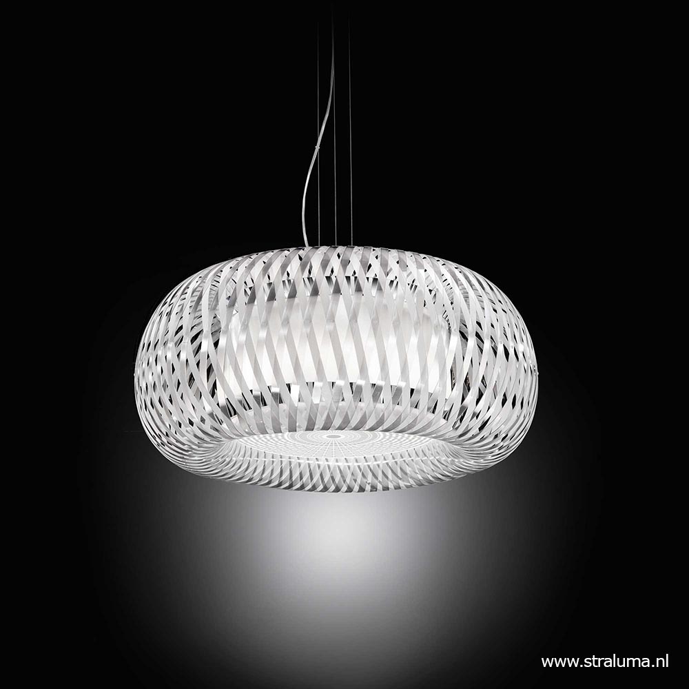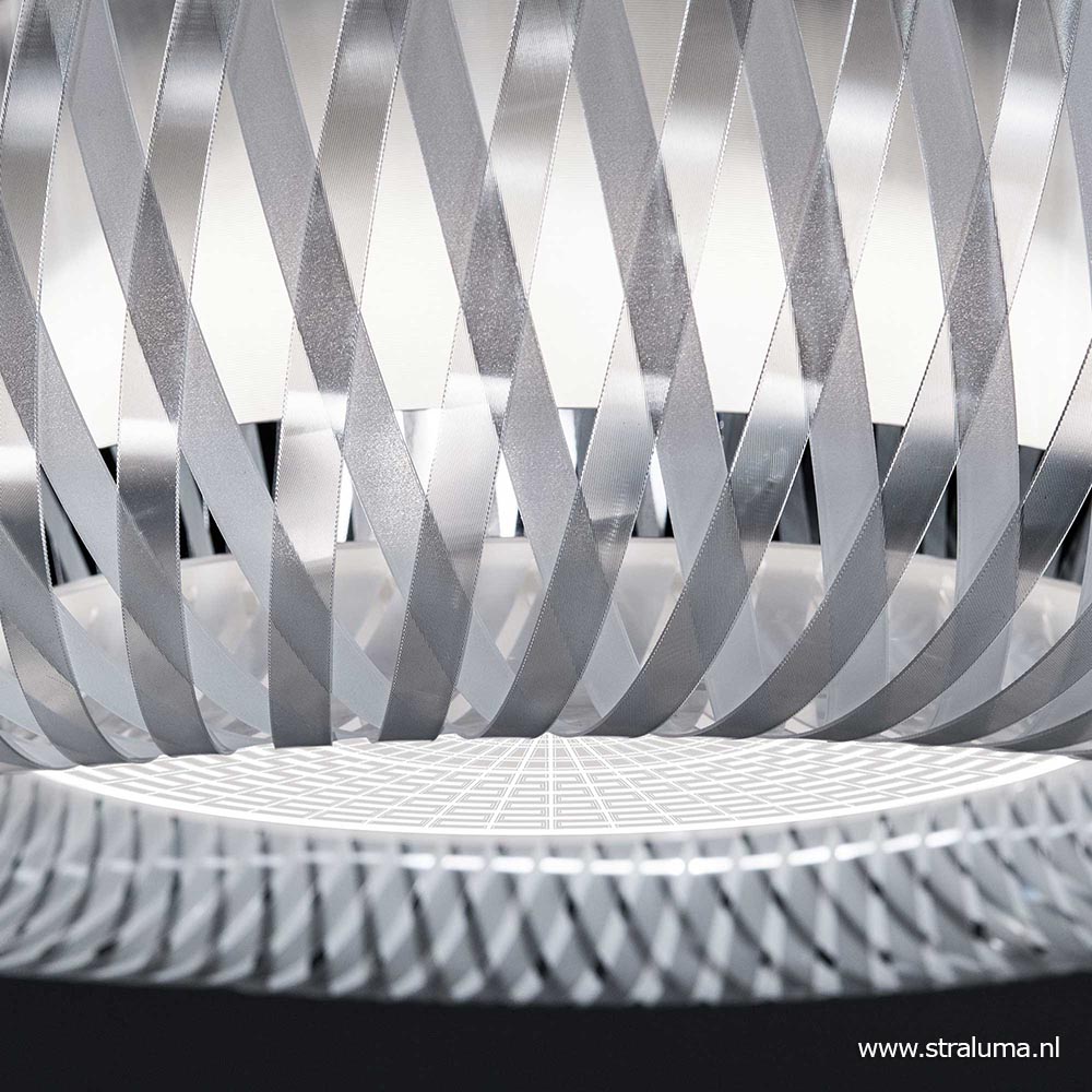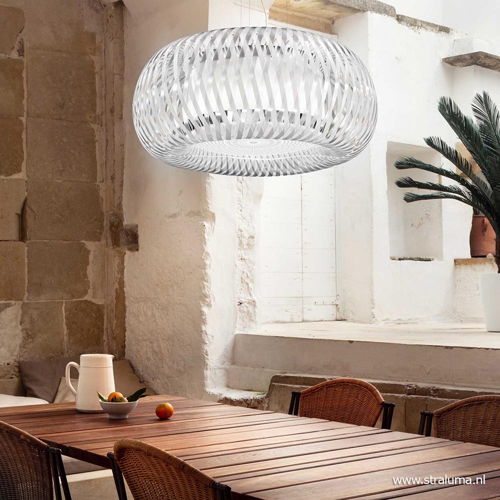 Italiaans design met een gevoel voor authenticiteit. Het design is geïnspireerd op de oude techniek van het weven van manden zoals vroeger al werd gedaan. De techniek geeft de lamp een architectonisch design wat de lamp een echte eye-catcher in huis maakt. De kap is voorzien van twee ‘lagen’:de geweven buitenlaag en de kunststof binnenkap waarbinnen zich de lichtbronnen bevinden (exclusief, 4x E27). Het kunststof is voorzien van een metalen finish aan de buitenzijde wat de lamp een robuuste uitstraling geeft, en een glanzende binnenzijde voor een luxe design uitstraling. De kunststof diffuser zorgt voor een fijne sfeervolle lichtverspreiding en tevens dat er niet in de lichtbron kan worden gekeken. De design kap hangt aan drie staaldraden en heeft een transparant snoer. De hanglamp wordt aan het plafond opgehangen met een ronde witte bevestiging.