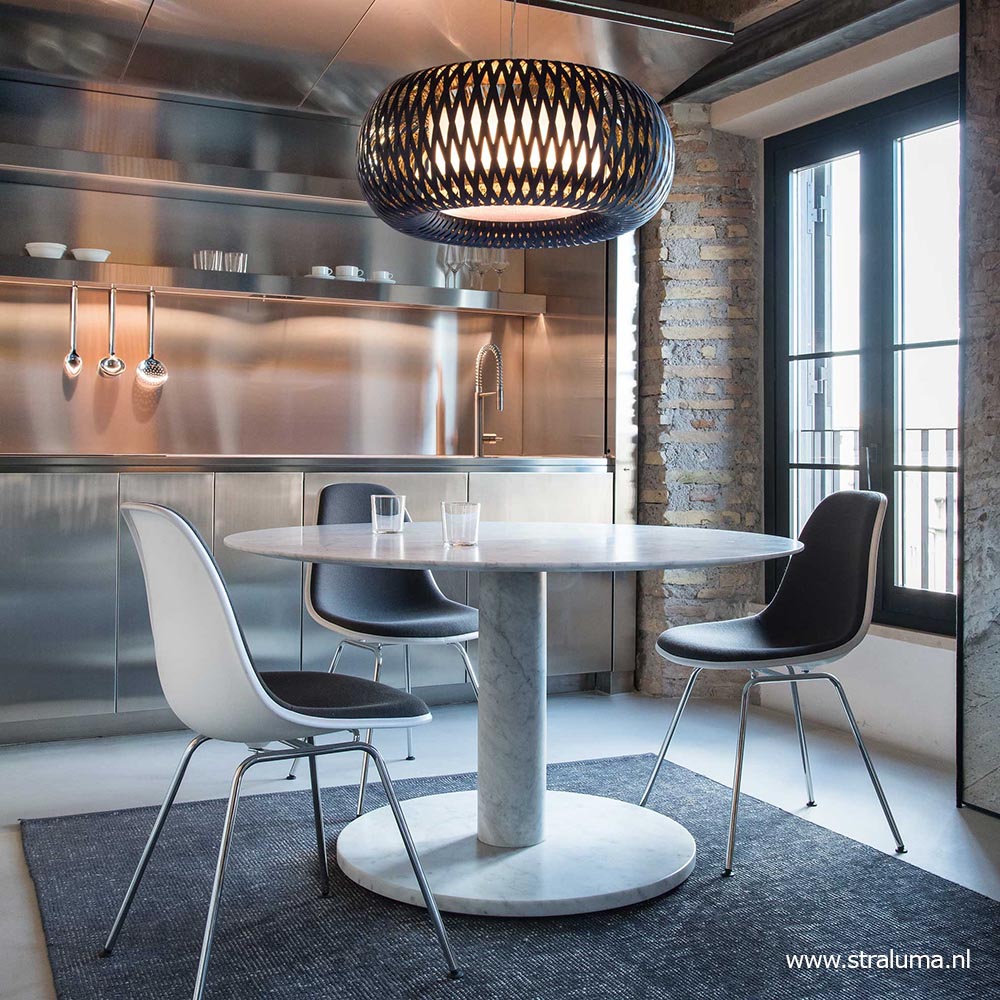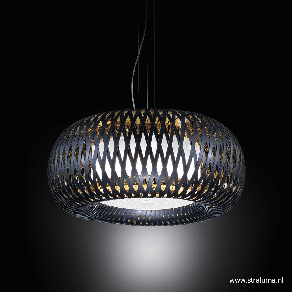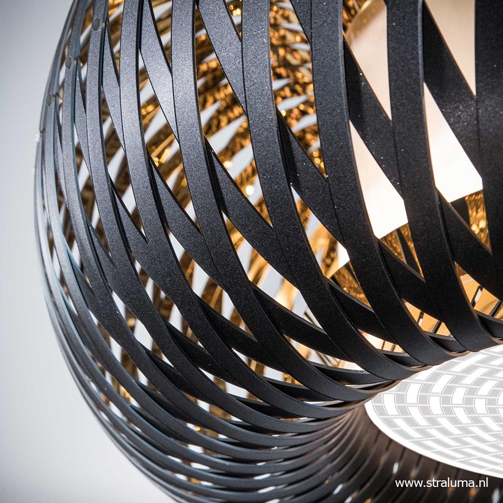 Italiaans design met een gevoel voor authenticiteit. Het design is geïnspireerd op de oude techniek van het weven van manden zoals vroeger al werd gedaan. De techniek geeft de lamp een architectonisch design wat de lamp een echte eyecatcher in huis maakt. De kap is voorzien van twee ‘lagen’: de geweven buitenlaag en de kunststof binnenkap waarbinnen zich de lichtbronnen bevinden (exclusief, 4x E27). Het kunststof is voorzien van een mat zwart metalen finish aan de buitenzijde wat de lamp een robuuste uitstraling geeft, en een gouden glanzende binnenzijde voor een luxe design uitstraling. De kunststof diffuser zorgt voor een fijne sfeervolle lichtverspreiding en tevens dat er niet in de lichtbron kan worden gekeken. De design kap hangt aan drie staaldraden en heeft een transparant snoer. De hanglamp wordt aan het plafond opgehangen met een ronde zwarte bevestiging.