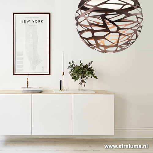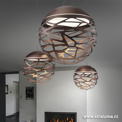 Deze design hanglamp Kelly bol brons (bruin) is een prachtige strak klassieke hanglamp. Een sterk staaltje Italiaans design met een speelse knipoog. Zeer mooi afgewerkt. Erg mooi in een vide in combinatie met de kleine versie (19870022). Door de blender kijkt u nooit in de lichtbron. Een mooie hanglamp voor boven de eettafel of salontafel.
