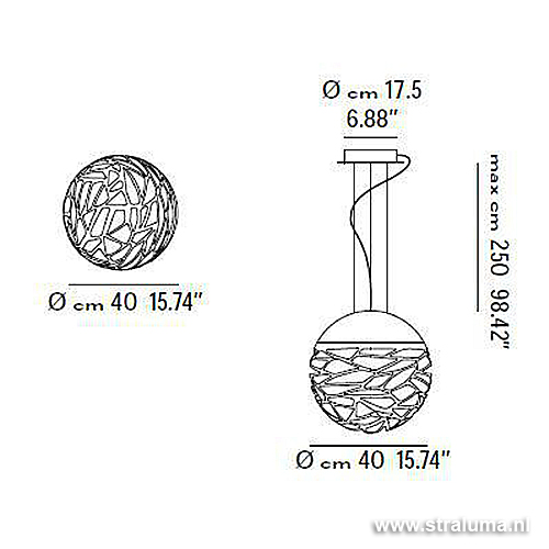 – Ø 40 cm – maximale hoogte 250 cm – plafondbevestiging Ø 17,5 cm, hoogte 3 cm – ook geschikt voor energiezuinige lichtbronnen – ook in wit verkrijgbaar