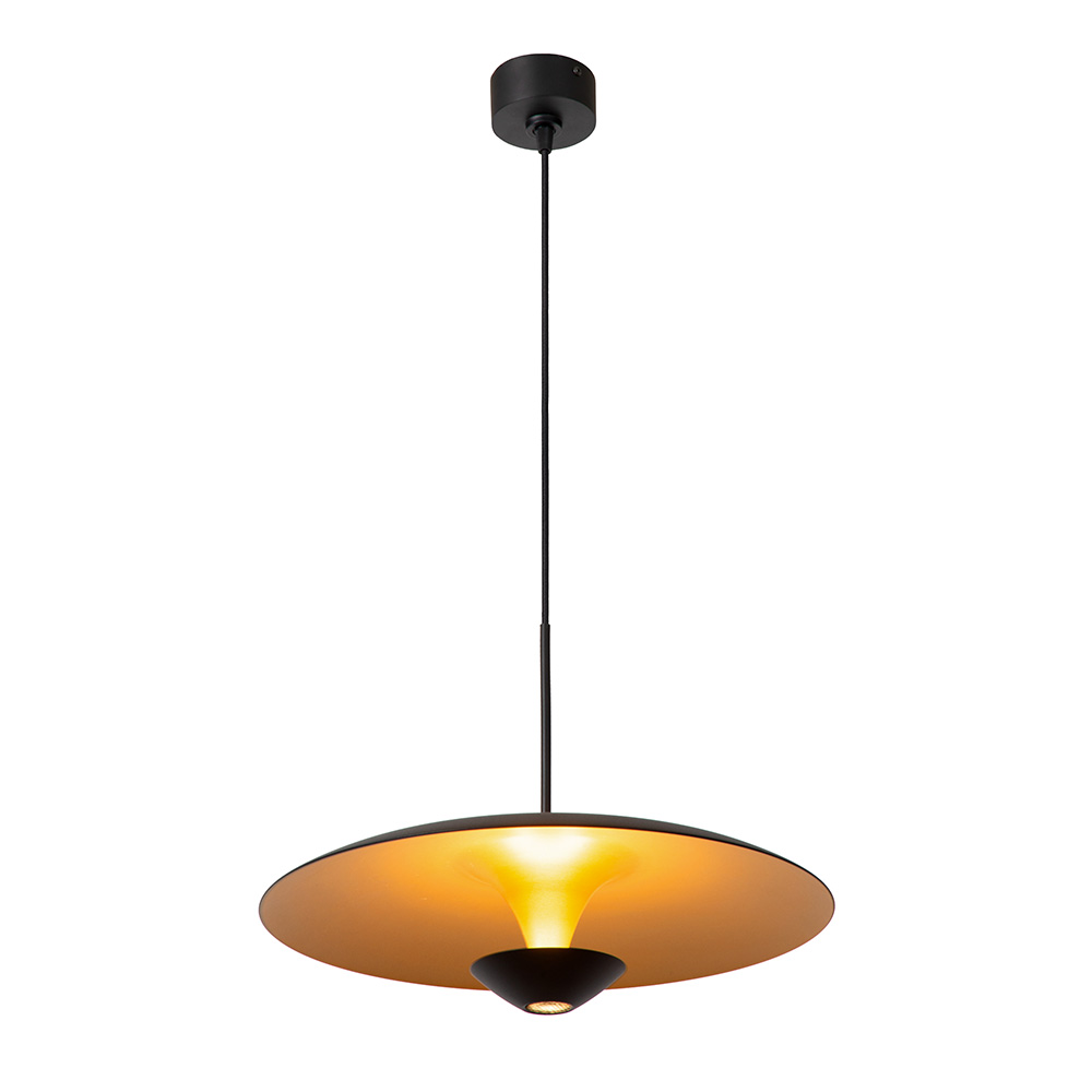 Deze opvallende design hanglamp is een echte eyecatcher in je interieur. Met zijn brede, schotelvormige kap in matzwart met een warme gouden binnenzijde, zorgt de lamp voor een elegante en luxueuze uitstraling. De geïntegreerde LED-spot in het midden werpt een prachtig, indirect licht, wat een sfeervolle gloed creëert op de binnenzijde van de kap én in de ruimte. Het strakke ontwerp met verfijnde details maakt deze hanglamp ideaal boven een eettafel, salontafel of in een zithoek. Dankzij de goudkleurige binnenzijde geeft de lamp een warm en uitnodigend licht, perfect voor een gezellige ambiance.