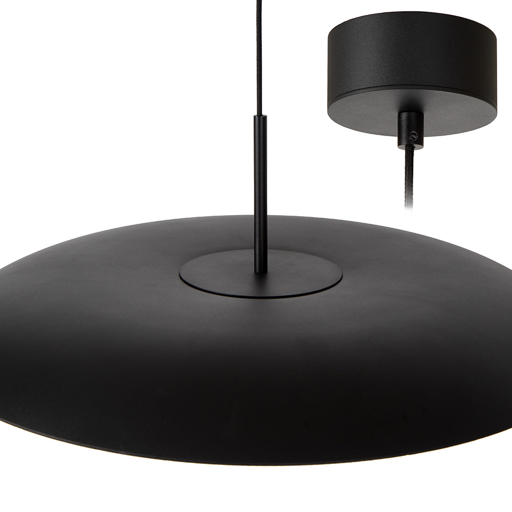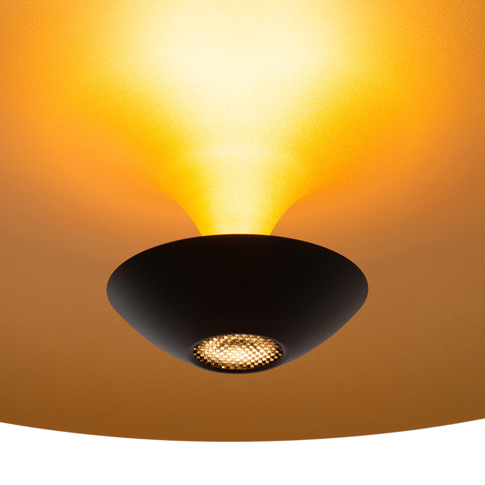 Deze opvallende design hanglamp is een echte eyecatcher in je interieur. Met zijn brede, schotelvormige kap in matzwart met een warme gouden binnenzijde, zorgt de lamp voor een elegante en luxueuze uitstraling. De geïntegreerde LED-spot in het midden werpt een prachtig, indirect licht, wat een sfeervolle gloed creëert op de binnenzijde van de kap én in de ruimte. Het strakke ontwerp met verfijnde details maakt deze hanglamp ideaal boven een eettafel, salontafel of in een zithoek. Dankzij de goudkleurige binnenzijde geeft de lamp een warm en uitnodigend licht, perfect voor een gezellige ambiance.
