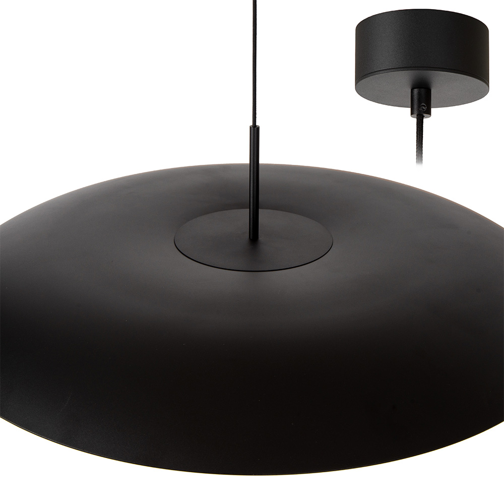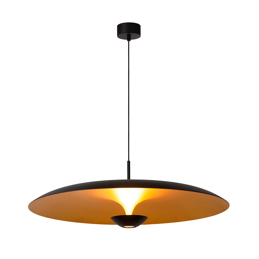 Deze opvallende design hanglamp is een echte eyecatcher in je interieur. Met zijn brede, schotelvormige kap in matzwart met een warme gouden binnenzijde, zorgt de lamp voor een elegante en luxueuze uitstraling. De geïntegreerde LED-spot in het midden werpt een prachtig, indirect licht, wat een sfeervolle gloed creëert op de binnenzijde van de kap én in de ruimte. Het strakke ontwerp met verfijnde details maakt deze hanglamp ideaal boven een eettafel, salontafel of in een zithoek. Dankzij de goudkleurige binnenzijde geeft de lamp een warm en uitnodigend licht, perfect voor een gezellige ambiance.