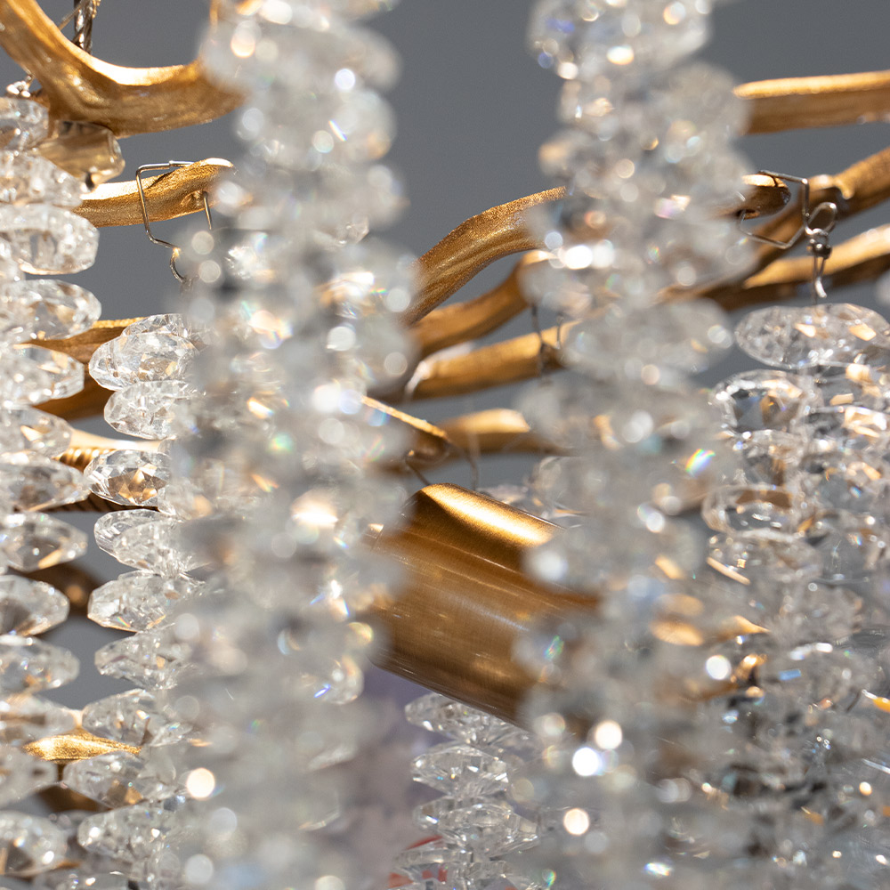 De schittering van het licht dat weerkaatst op de fijne kristalelementen zorgt voor een rijke, warme sfeer. Ideaal als statement boven een grote eettafel, in een hoge entree of boven een vide – deze lamp laat gegarandeerd een onvergetelijke indruk achter.
