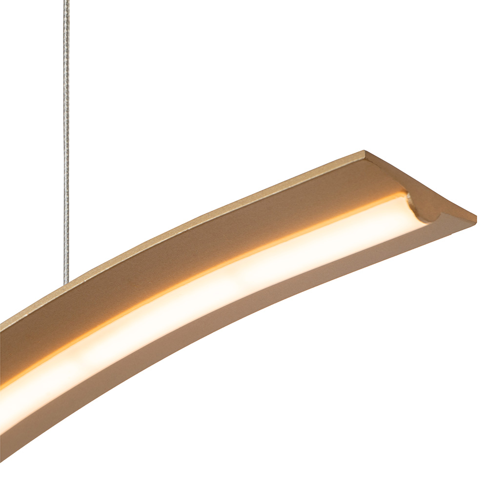 Details: – Afmetingen: 160x 8x 220 cm (lxbxh) – Kap: 160x 4x 40 cm – Bevestiging: ø18 x 5 cm – Kabellengte: 180 cm – Kleur: Goud – Materiaal: PVC & metaal – Geïntergreerd LED -dimbaar,Ja, dimmer niet inbegrepen – Gewicht: 1,8 kg – Max. 33W – 3100 Lm – 2700 K – In hoogte verstelbaar tot max 220 cm