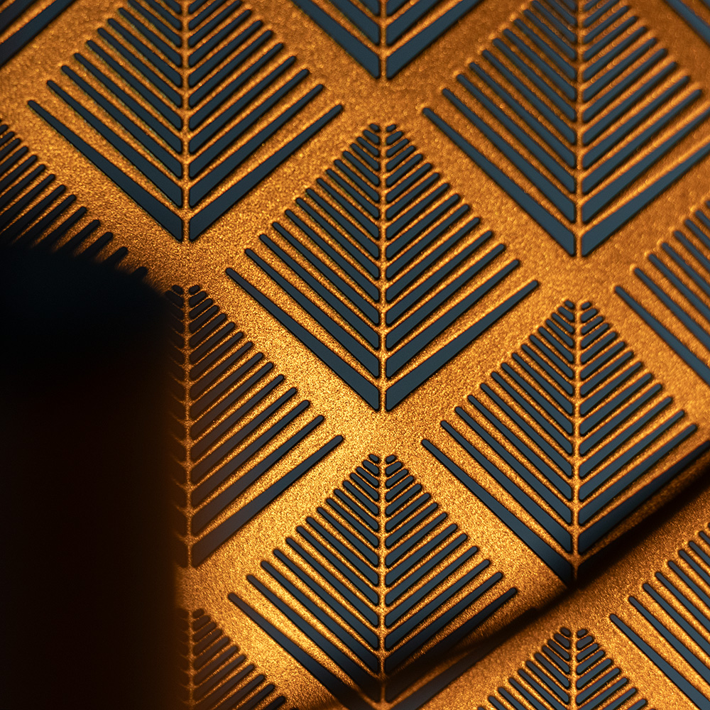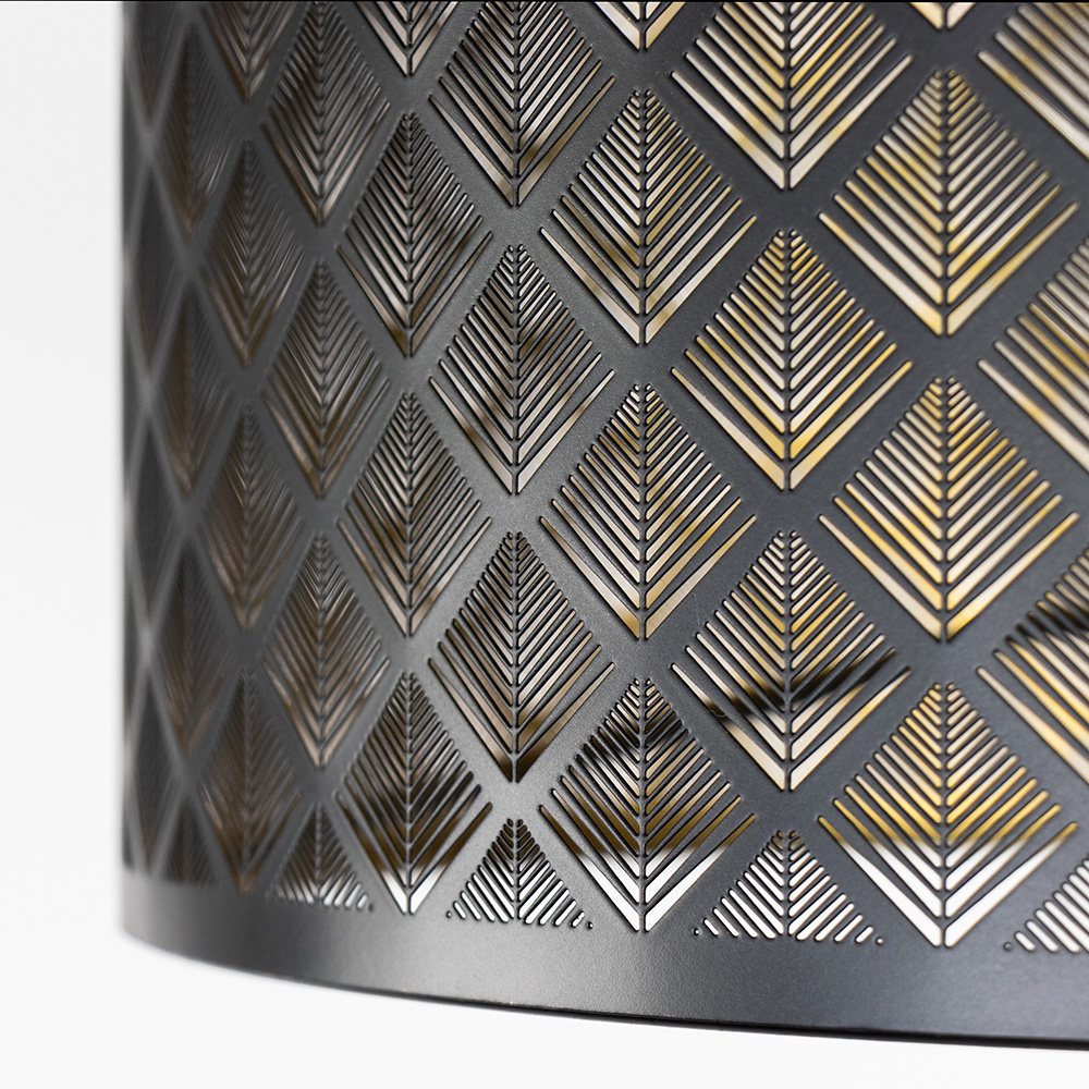 Deze stijlvolle hanglamp combineert modern design met een sfeervolle uitstraling. De metalen lampenkap heeft een subtiel, geometrisch patroon dat zorgt voor een speelse verspreiding van licht. De zwartkleurige buitenkant en goudkleurige binnenzijde creëren samen een warme en luxueuze ambiance. Ideaal voor boven de eettafel, in de woonkamer of hal.